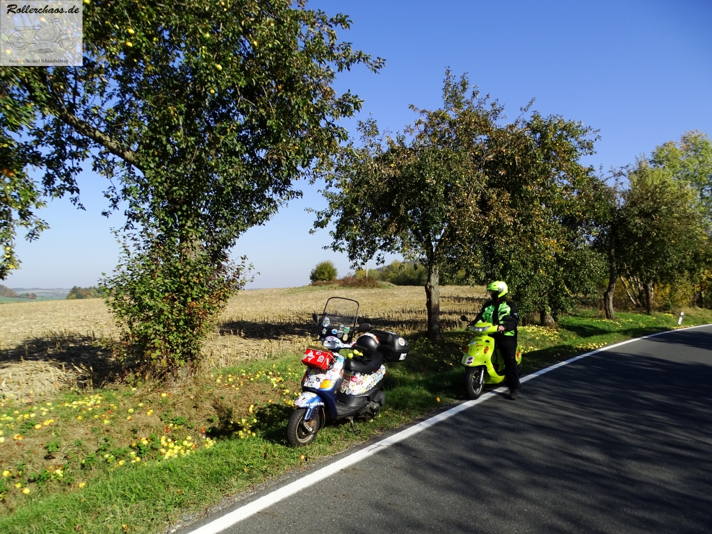 Einige am Straßenrand aufgelesene Äpfel kamen noch als Wegzehrung und essbares Andenken mit, bevor es auf der wunderbar gewundenen Straße durch den Wald hinauf nach Vyhledy ging.