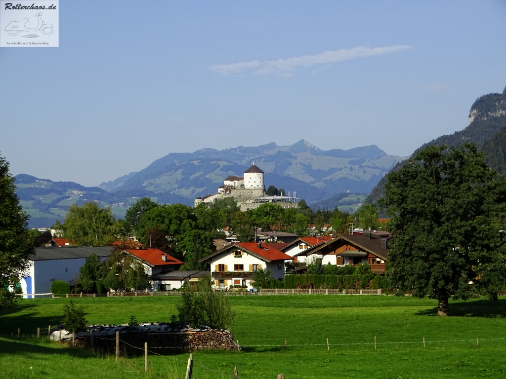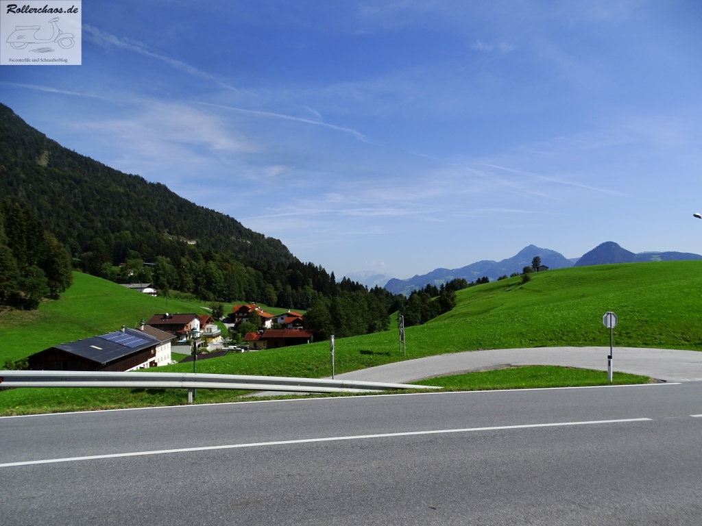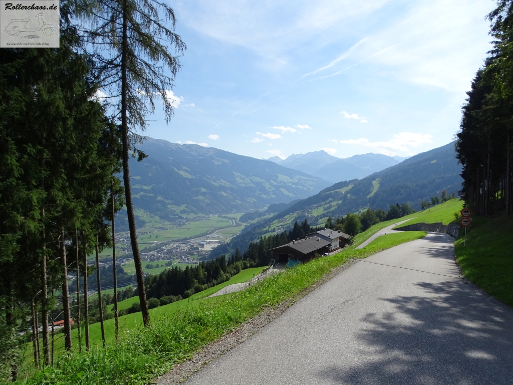 Vom Arbisjochkopf geht es dann in steilem Serpentinenschwung hinab ins Zillertal nach Hippach, dem südlichen Talort der Straße. Da der kleine Zweitakter ohnehin keine nennenswerte Bremswirkung hat, lasse ich ihn jetzt rasten und der Roller wird nur durch die Schwerkraft ins Tal getrieben.Auf dem Talgrund geht es dann, immer am Ziller entlang, wieder nach Norden. Sanfter, ebener Straßenschwung und sattgrüne Wiesen sind ein scharfer Kontrast zur wilden Bergwelt hoch oben. Am Talausgang biege ich rechts ab, auf der B171 entlang des Inn über Brixlegg und Wörgl nach Kufstein.