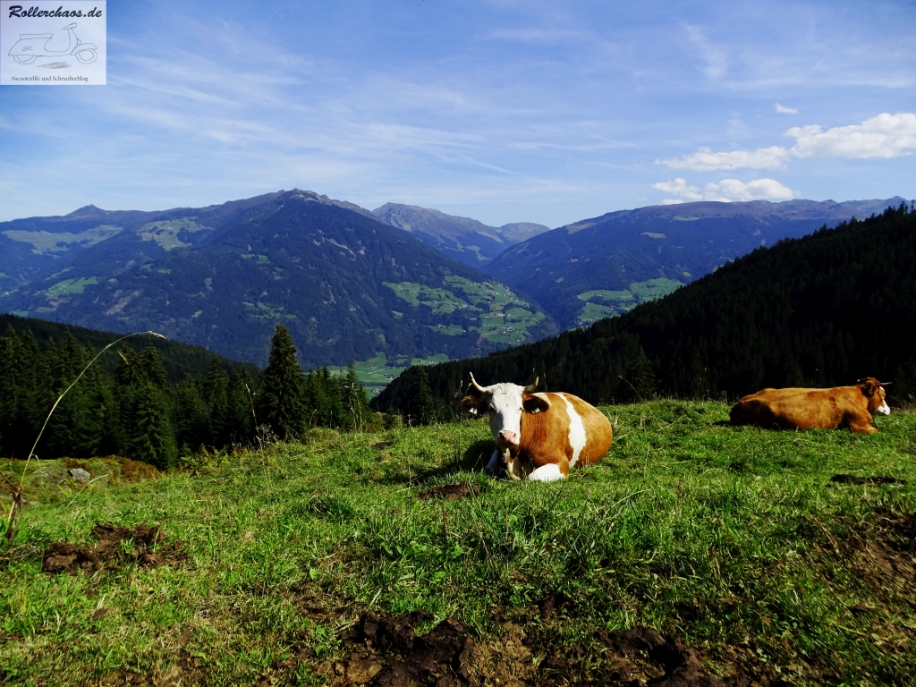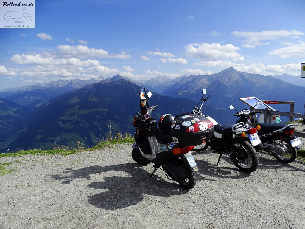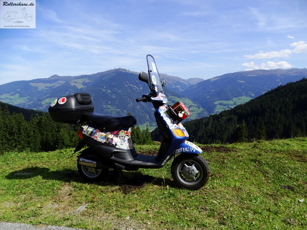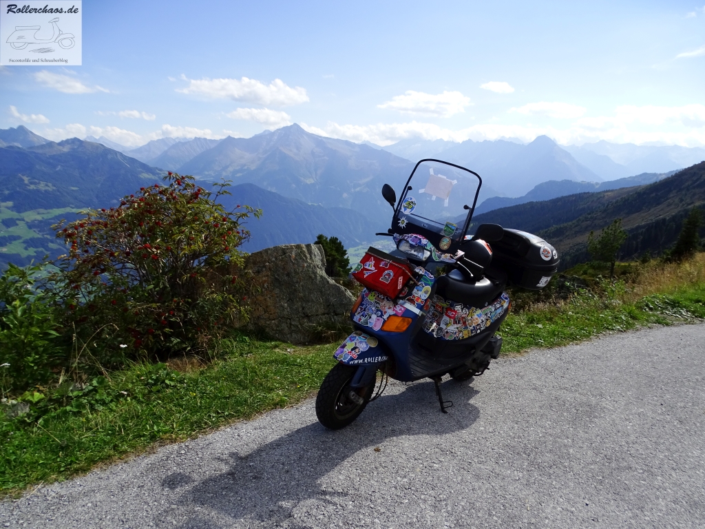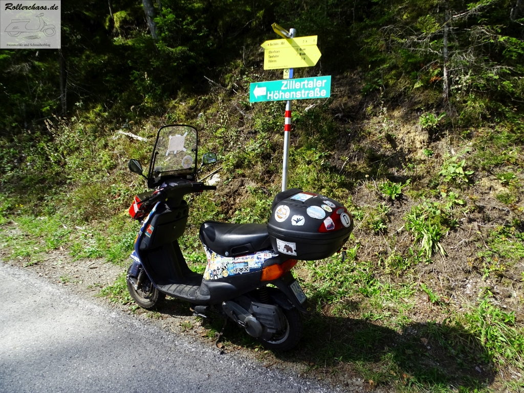 Man muss dazu vorausschicken, dass sich die Zillertaler Höhenstraße von anderen Touristenstraßen der österreichischen Alpen grundlegend unterscheidet. Zwar ist sie, gegen eine geringe Mautgebühr, für den öffentlichen Verkehr freigegeben und auch tourisisch einigermaßen erschlossen, dennoch hat sie sich ihren Charakter als hochalpiner Wirtschaftsweg zur erleichterung der Almwirtschaft bis heute bewahrt. Der Straßenzustand ist auch eher für einen Traktor angetan als für einen Roller. Es gibt tatsächlich noch einige grob geschotterte Abschnitte und abgesehen von einigen besonders gefährlichen Sektionen fehlt jede Absturzsicherung. Es ist daher kaum verwunderlich, dass diese Straße frei von den Auswüchsen der Sportwagen- und Rennmotorradfraktion geblieben ist. Bei Genussreisenden und Enduristen ist sie dafür umso beliebter. Dass sie mit knapp 20km Länge der Hauptstrecke und teils heftigsten Steigungen (deren genauer Wert nirgends beschilder ist) für einen Fuffiroller eine echte Herausforderung ist, braucht wohl nicht gesonders erwähnt zu werden.