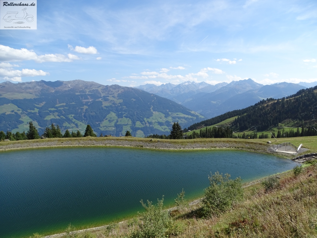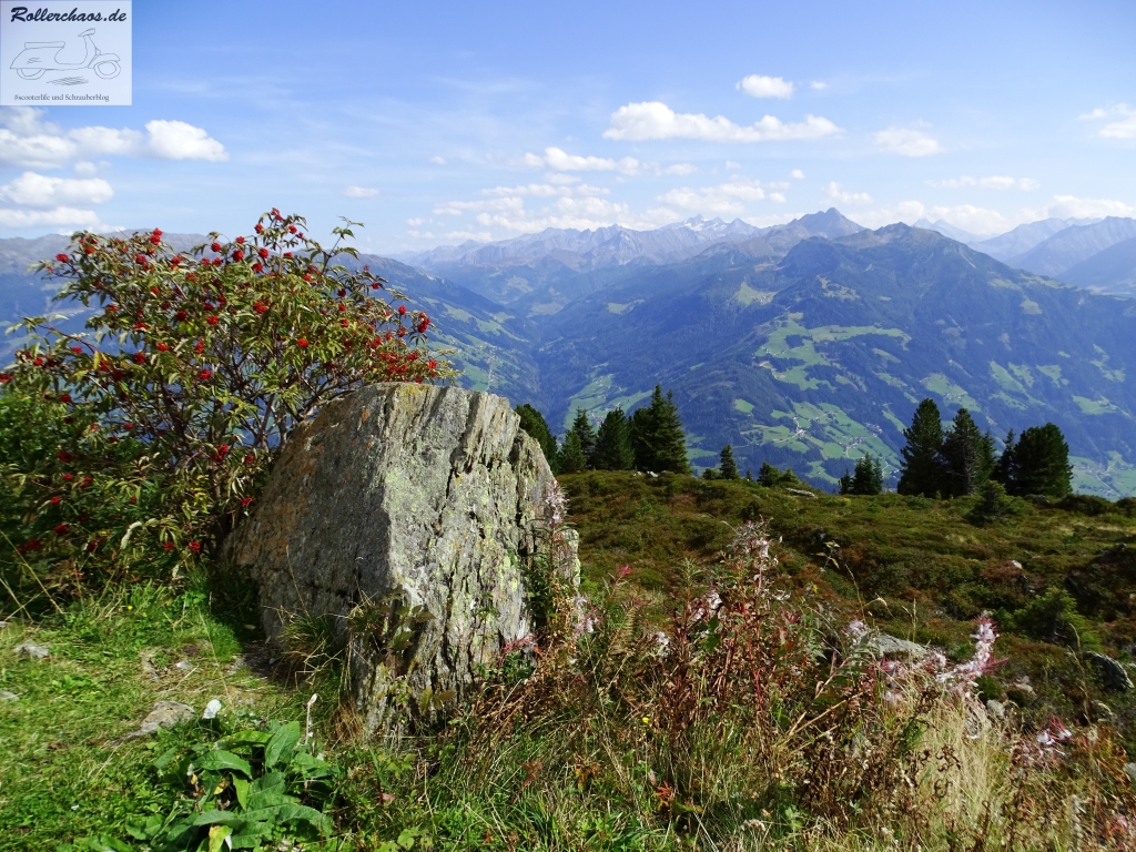 Die Alm ist zwar bei weitem nicht der höchste Punkt der Straße, dafür bietet sie aber mit einem gut geführten Gasthof und einer spektakulären Aussicht auf das Zillertal einen perfekten Punkt für eine Rast. Für mich gibt es hier eine Riesenportion Kaiserschmarn und für den Roller die willkommene Gelegenheit abzukühlen.