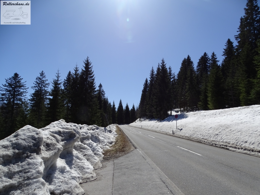 Trotz der Schneemauern neben der Straße ist es angenehm warm und das vorherrschende Geräusch ist das Rauschen von Schmelzwasser in den zahlreichen Bachläufen am Straßenrand. Auch hier hat der Winter seine letzte Schlacht verloren.