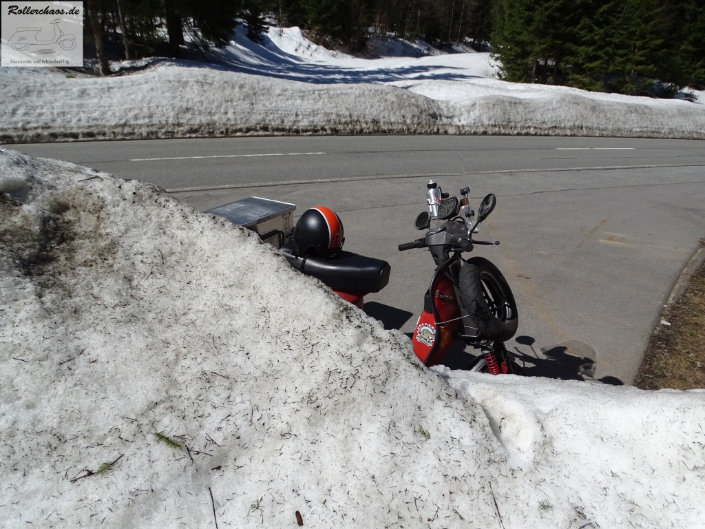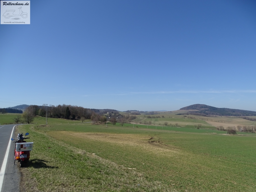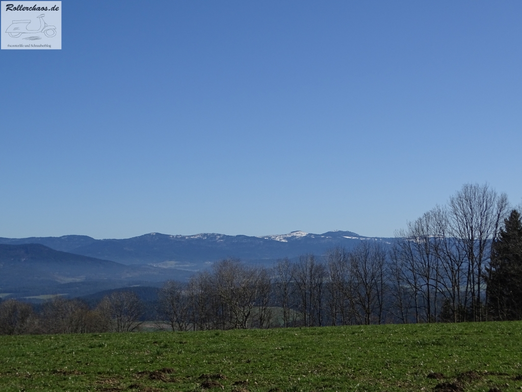 Sankt Englmar markiert, knapp über 900m hoch, den ersten Hochpunkt des Tages. In den Wäldern entlang der Straße liegt noch Schnee, aber es ist warm und sonnig. Der Blick über das Viechtacher Becken hinüber zu den Höhen des Mittelgebirges ist herrlich frei und es ist eine Freude, den Roller unbeschwert ins Tal hinab laufen zu lassen.