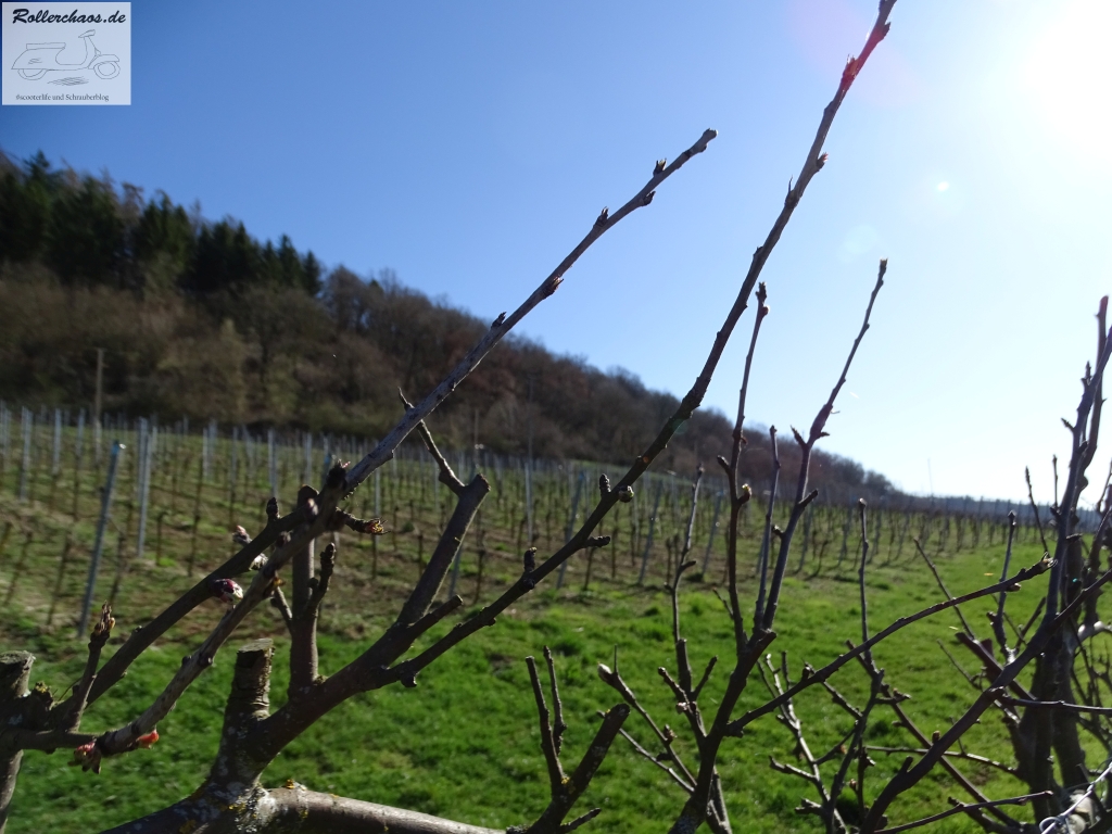 So früh im Jahr sind die Weingärten an den Südhängen des Vorwaldes noch ein trostloser Anblick. Es ist kaum zu glauben, dass aus den verdorrt und tot wirkenden Stämmen bald reiches Grün und herrliche Trauben wachsen werden. Ebenso herrlich ist auch der angenehm ruhige, leicht geschwungene Straßenverlauf entlang der Donau bis nach Wörth.