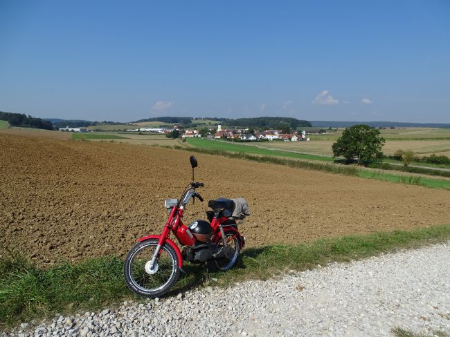 Trotz des deutlich erkennbaren Leistungsmangels machte die weitere Fahrt viel Spaß. Über durchwegs flaches Gelände ging es an Eining vorbei nach Neustad und von dort aus richtung Norden auf der B299 nach Mindelstetten. Die Ortschaft bildete gleichsam das Tor zum Jura und hier, wieder abseits der Hauptverkehrsstraße, glitt das Moped nun immer weiter hinein ins Hügelland der Juralandschaft.