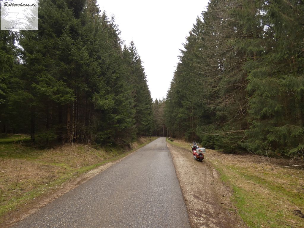 Im Kelheimer Forst haben die Winterstürme schwer getobt. Die Straße durch den Wald nach Thumhausen ist eigentlich gesperrt, mit einem Auto wäre sie auch nicht befahrbar, aber der Roller passt an den umgefallenen Bäumen vorbei.
