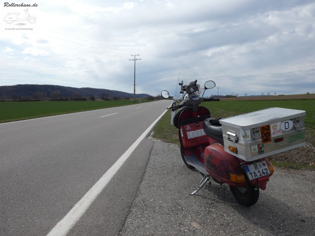Hier oben, zwischen Meierhofen und Painten, ist keine Sau unterwegs. Genau so macht Rollerfahren Spaß. Einsame Strecken, kein Verkehr, nur Stille und die langsam erwachende Natur.
