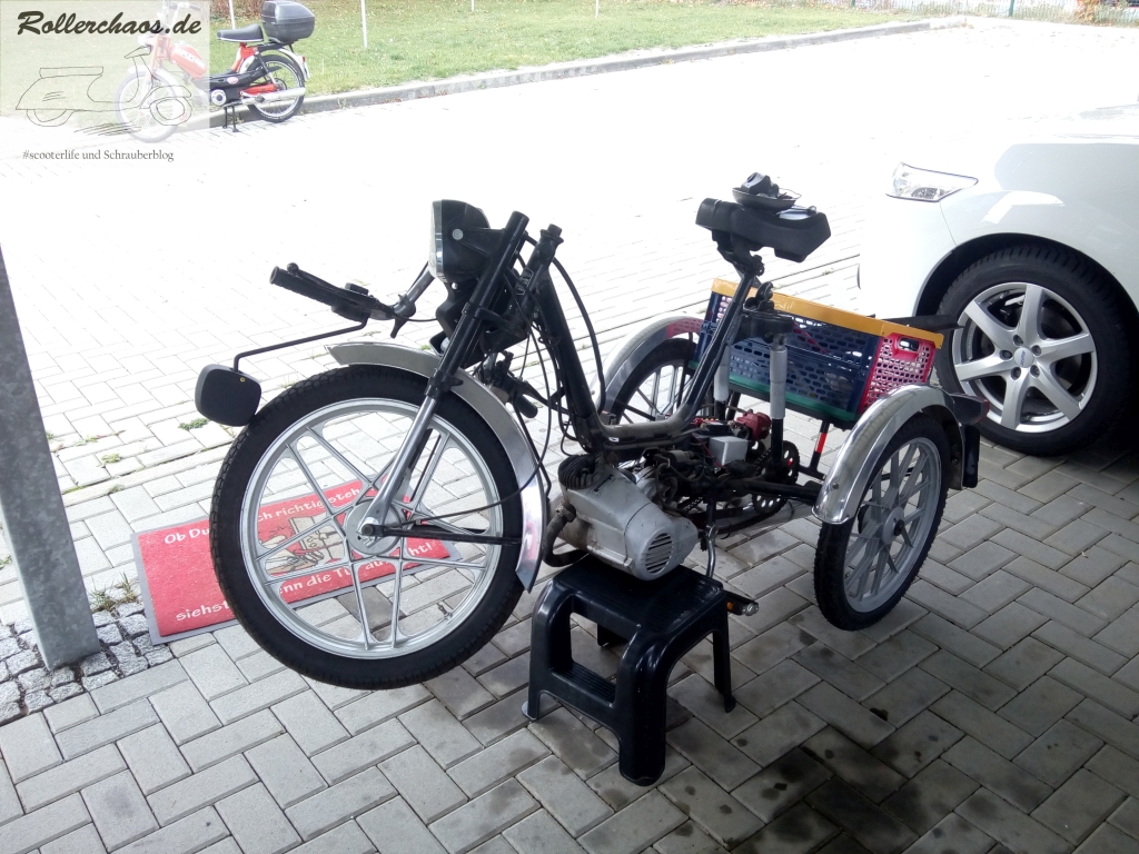 Außerdem ist es interessant zu sehen, wie das Fahrzeug gebaut ist. Das Fahrgestell einer Hercules Prima zum Dreirad umzubauen ist ja schön und gut, aber dann noch die exotische Dynastart-Version des Sachs 50 einzubauen, der so nie für den Gebrauch in diesem Chassis vorgesehen war, grenzt an Wahnsinn. Trotzdem erweckt das Fahrzeug nicht den Eindruck eines wilden "Frankensteins" sondern einer sauberen, logische Konstruktion.