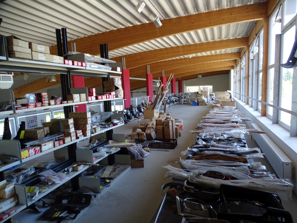 Das Museum bietet zudem etwas in dieser Form wohl einzigartiges: Auf der Empore der Ausstellungshalle lagern in Regalen und auf Paletten viele seltene Ersatzteile für historische Toyotawagen.