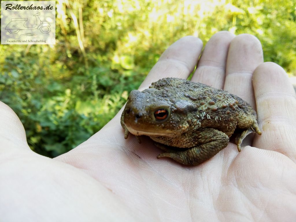 Ganz nebenbei lässt sich dann auch noch eine gute Tat tun. Die mitten auf der Hauptstraße sitzende Kröte hätte sonst sicher noch jemand überfahren.