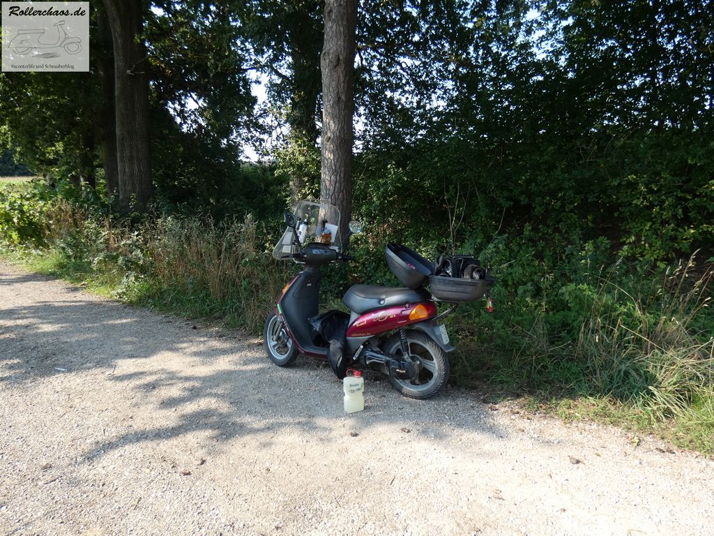 Kurz vor Hohenkammer, der Abzweig auf die B13 ist bereist in Sicht, beginnt der Motor zu stottern und geht aus. Ich lasse ihn in einem Feldweg ausrollen und notiere mir den Tachostand. Die Rechnung am Abend wird ergeben, dass die absolute Reichweite des Centro 286km beträgt und der Verbrauch bei normaler Überlandfahrt 2,9l/100km.