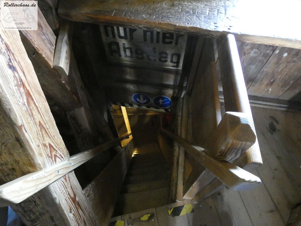 Die abenteuerliche, extrem steile und enge Treppe mag so alt wie der Turm selbst sein. Dem rüstigen Herrn aus Amarillo bereitet sie erstaunlich wenig Schwierigkeiten.