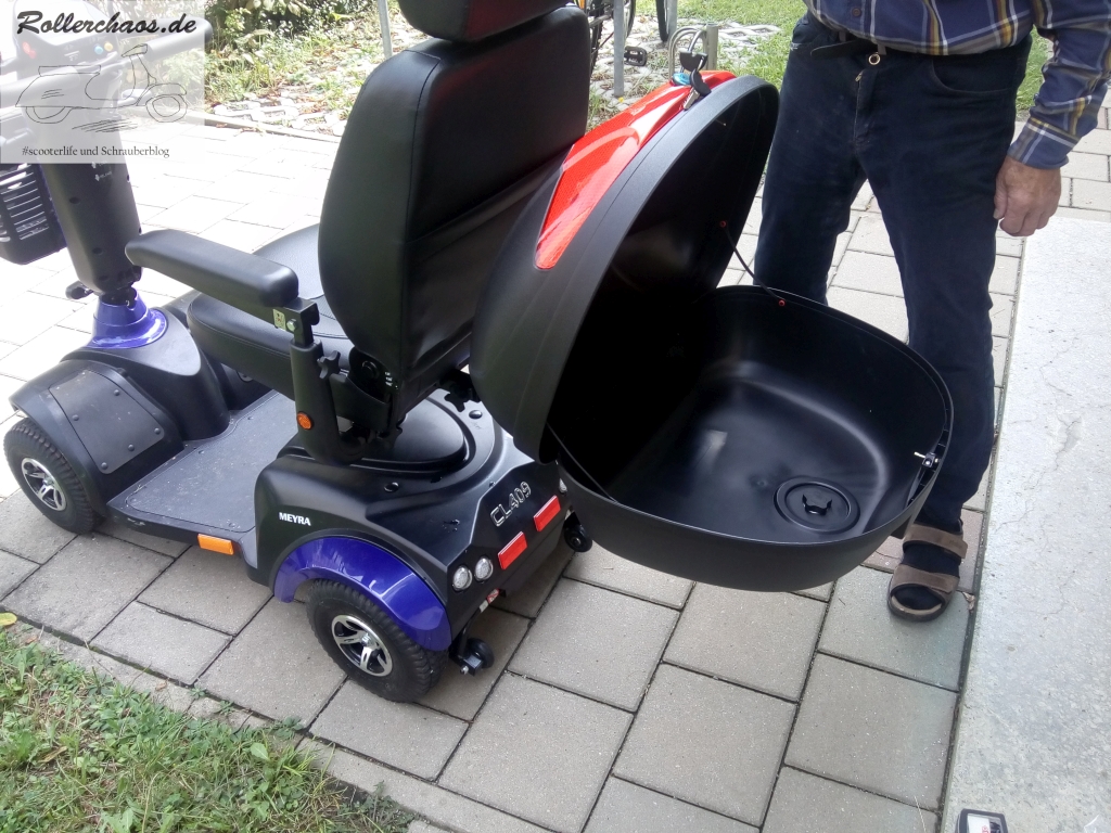 Mein Vater hat seit geraumer Zeit einen Meyra CL409 Mobilityscooter, ein grundsätzlich nicht schlecht funktionierendes Fahrzeug mit sehr gut durchdachter Konstruktion. Unter anderem gehört ein Einkaufskorb an der Front zur Fahrzeugausstattung. Was leider fehlt ist ein abschließbarer Stauraum, in dem man Dinge wie ein Regencape oder anderen Kleinkram geschützt lassen kann.