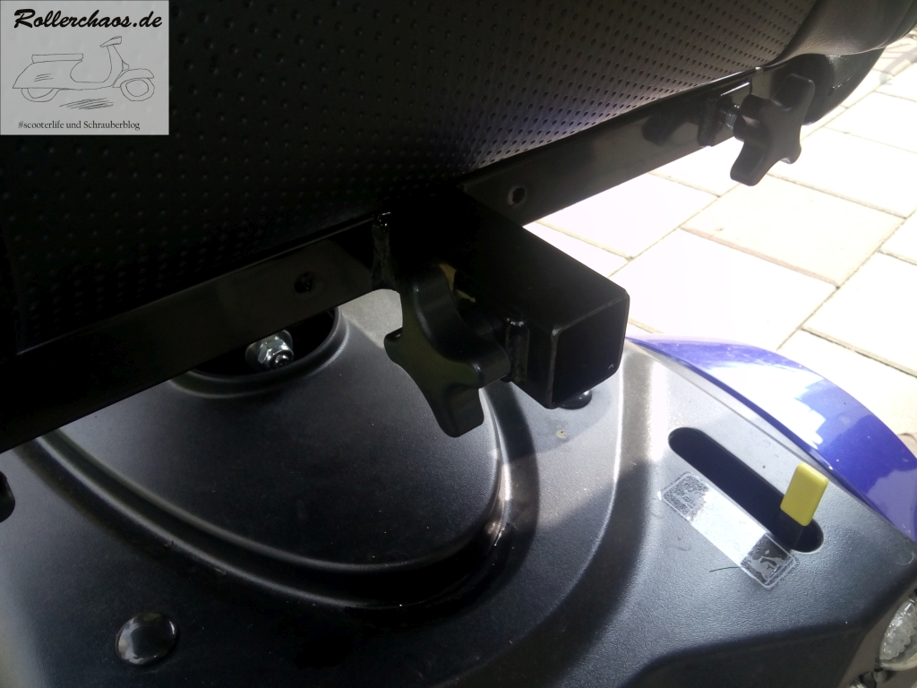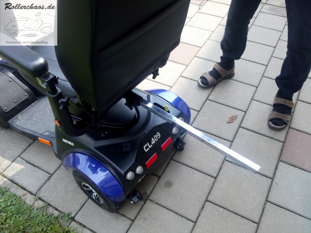 Denn tatsächlich bietet Meyra für den CL409 ein ganzes Aresenal an Zubehör an. Darunter auch einen Gehhilfenhalter und einen zweiten Einkaufskorb. Beides wird an einer Aufnahme an der Sitzbefestigung montiert, eine Vorrichtung die sich doch auch wunderbar für einen Topcaseträger eignen sollte.