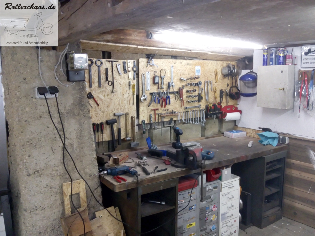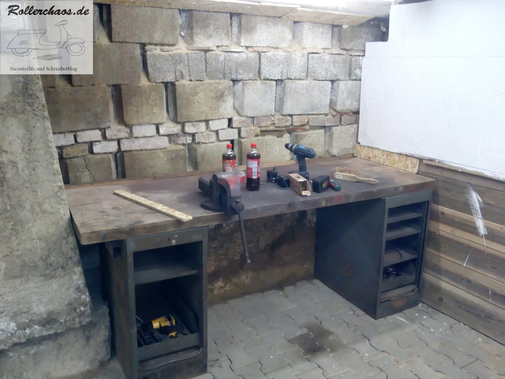Nachdem dann noch der komplette Werkzeugbestand umgezogen war nahm die Sache langsam Gestalt an. Aus einem leeren Raum wurde langsam eine Werkstatt die diesen Namen auch verdient.