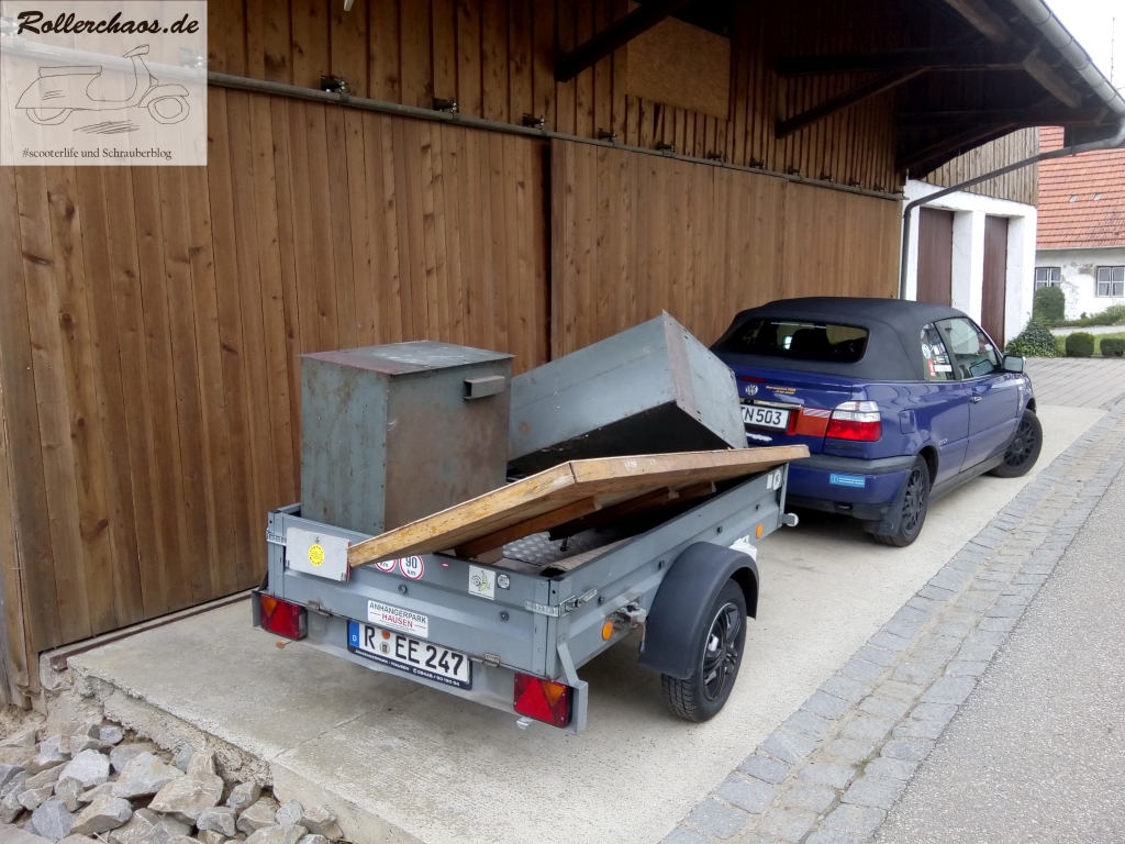 Nicht weggeworfen, aber weggegeben wird außerdem auch der Mopedanhänger. Ganz ehrlich? Ich brauche das Ding nicht und es raubt nur Platz und Zeit, die ich viel lieber in andere Projekte stecken würde. Falls sich jemand findet, der das Fahrgestell nimmt und fertig macht, kann er es gerne haben. Ansonsten geht es zurück an Ronny, von dem ich es ja ursprünglich übernommen hatte.