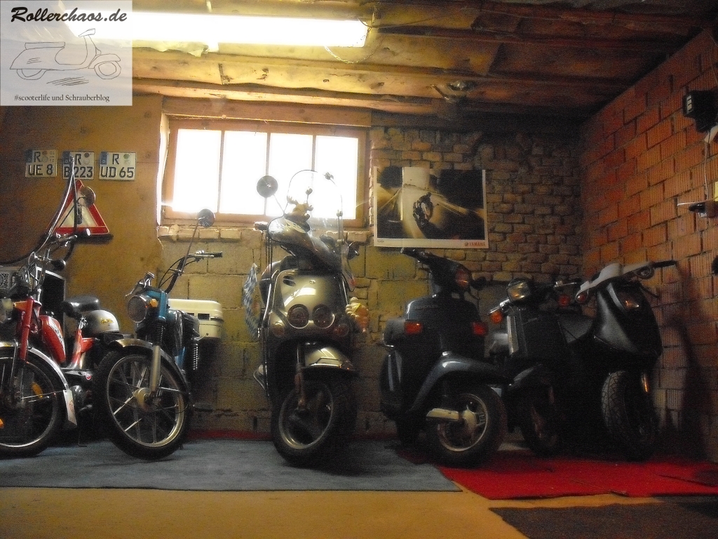 Tatsächlich ist das Foto vom arg zerrupften, aber tatsächlich als Alltagskarre gefahrenen, Derbi das älteste überlieferte Foto aus der alten Heimat des Rollerchaos. Das Lineup der damaligen "Werkstattbewohner", die mit Ausnahme des Derbi alle mir gehörten, ist ebenfalls historisch interessant und entstand am selben Tag.