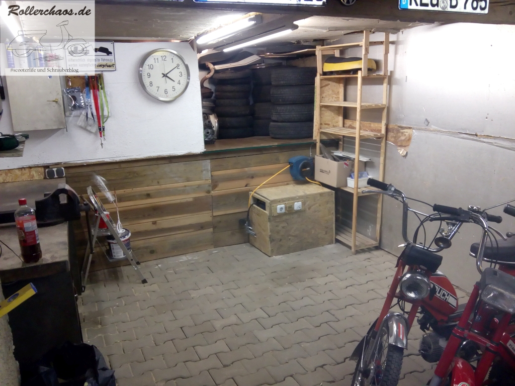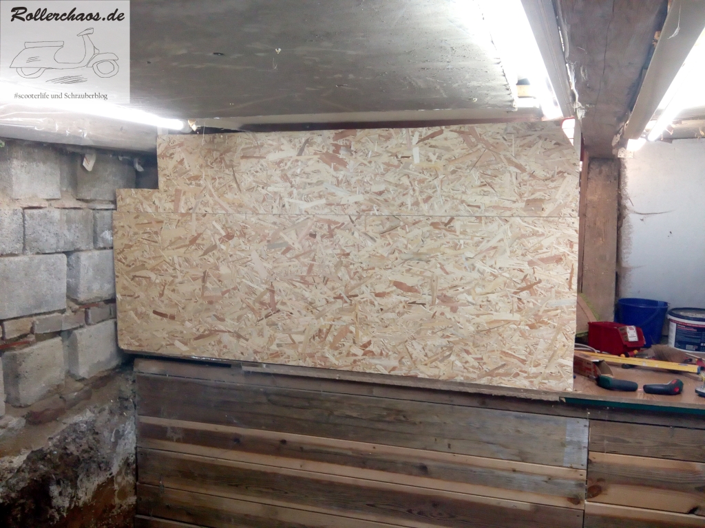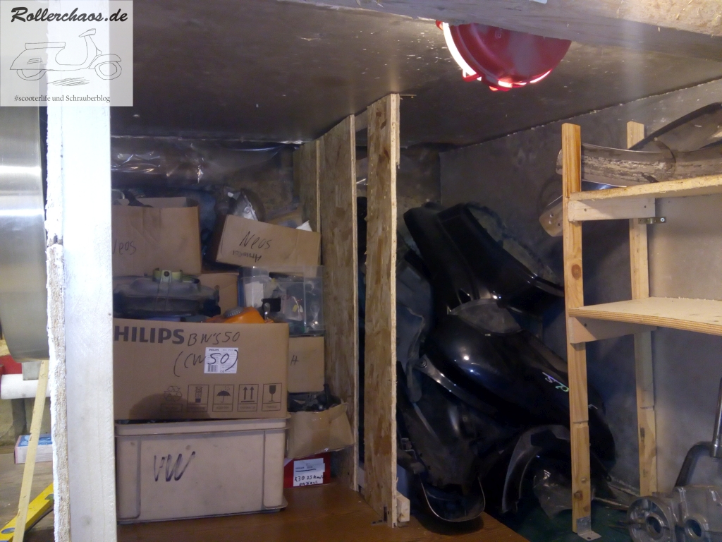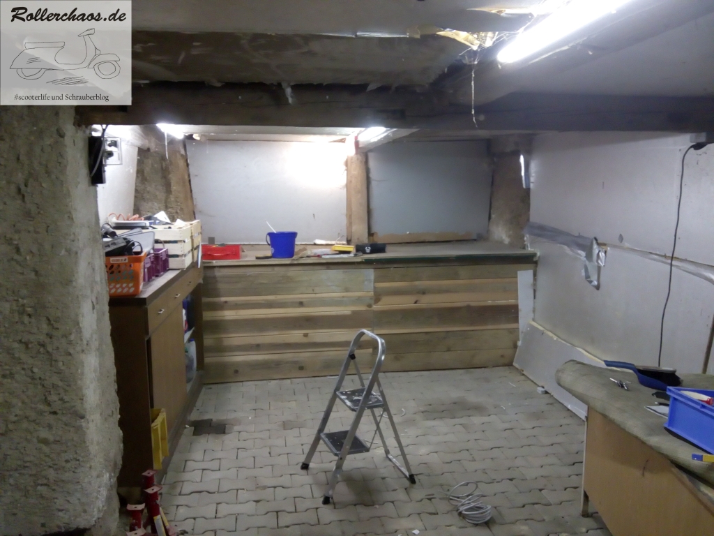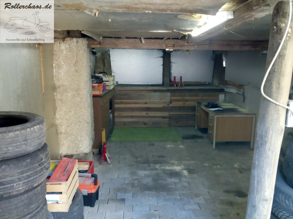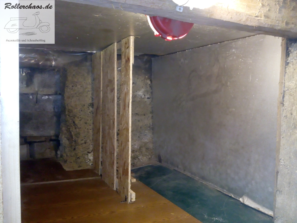 Das Podest im hinteren Bereich ist eine bauliche Besonderheit des neuen Raums. Darunter befinden sich ein Abwasserrohr und Teile des Fundaments. Die Holzverkleidung darum hatte der Vormieter, ein Quadschrauber, eingebaut und als Werkbank benutzt. Für mich ist dies keine Option, das Podest soll als "bekriechbares" Lager dienen und wurde darum teilweise räumlich abgegrenzt.