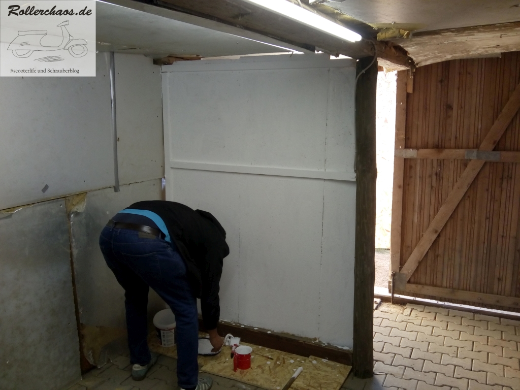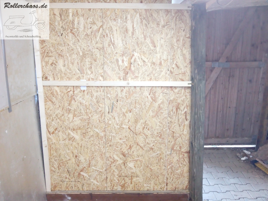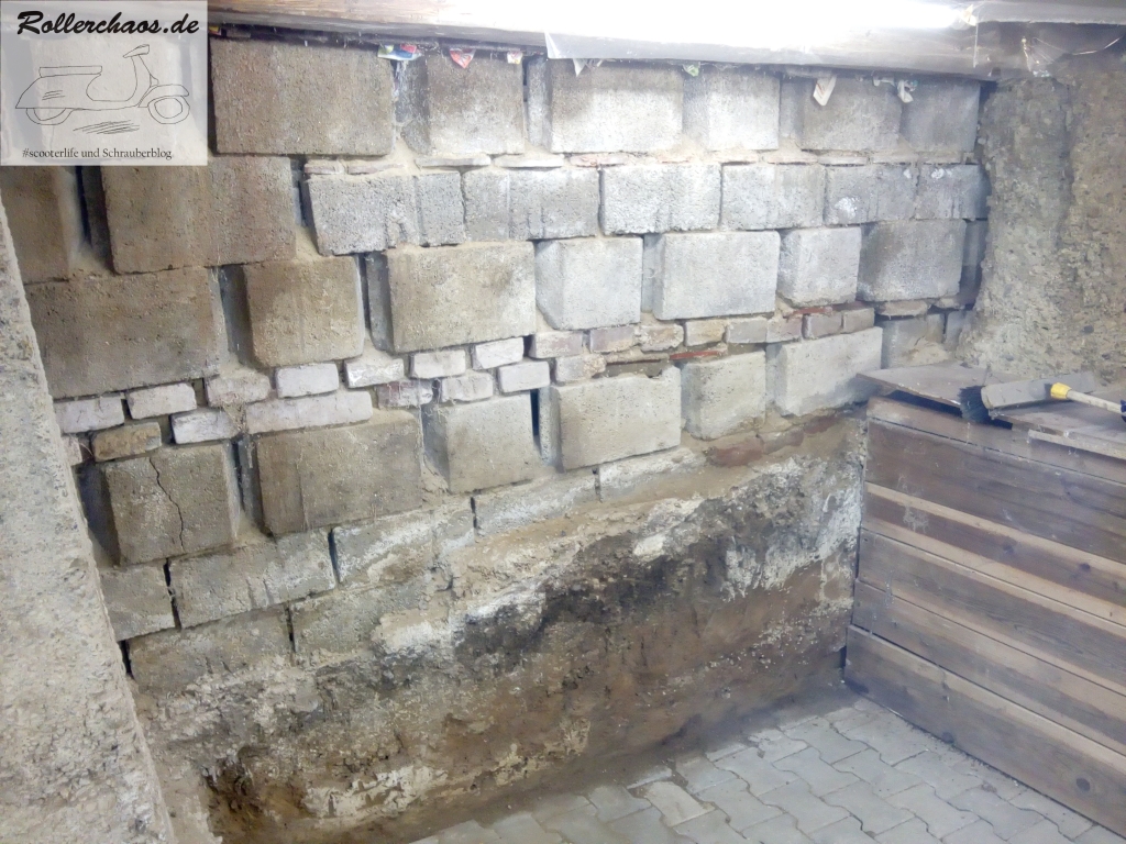 Vorher war jedoch noch eine weitere Wand zu erreichten. Zwischen dem sekrechten Stütztbalken und der Mauer nämlich, um den zukünftigen Rollerparkplatz vom Personeneingang abzugrenzen. Auch diese Wand soll einen mehrfachen Nutzen haben, jedoch hauptsächlich als Wind- und Sichtschutz bei geöffneter Tür dienen.