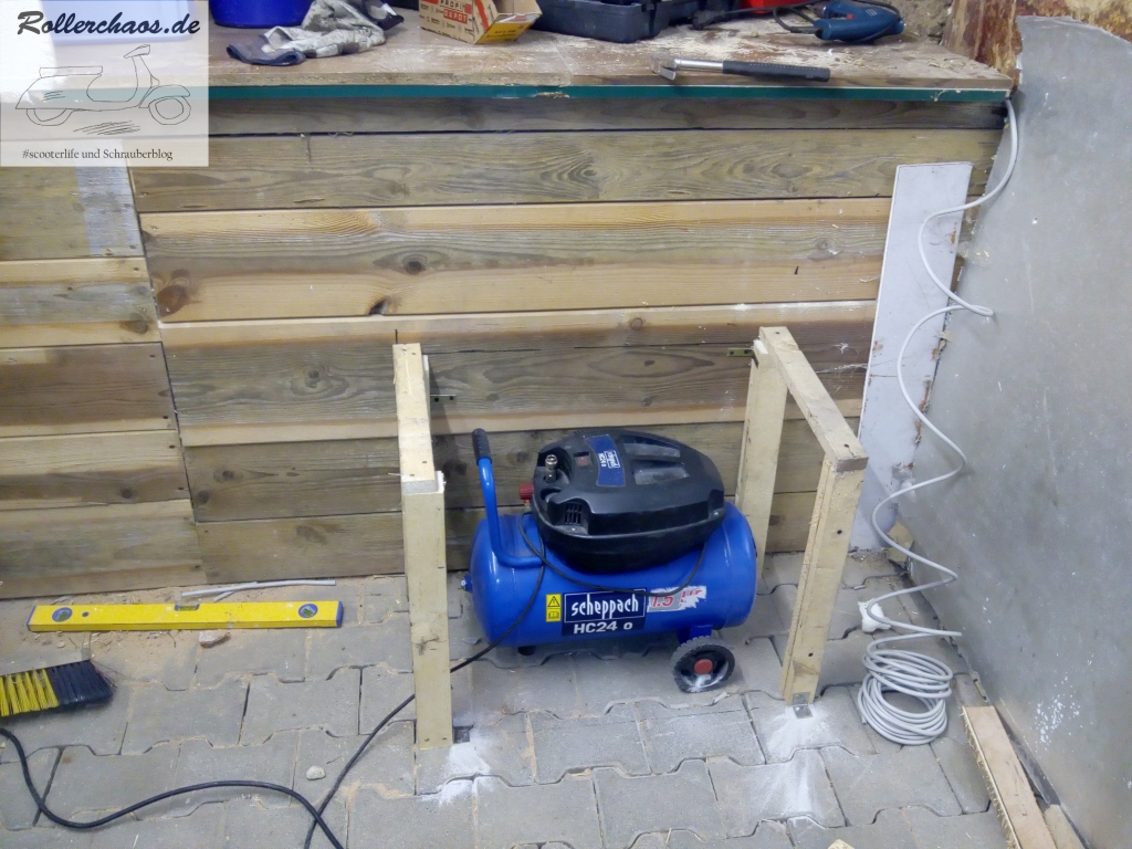 Das letzte größere Bauprojekt im neuen Raum war derweil das Einhausen des Kompressors. Eine Sache die sich, einfach aus Lärmschutzgründen, im alten Raum schon sehr bewährt hatte. Zudem wird die Einhausung jetzt auch als Trittstufe zum erleichterten Zugang ins Lager dienen.