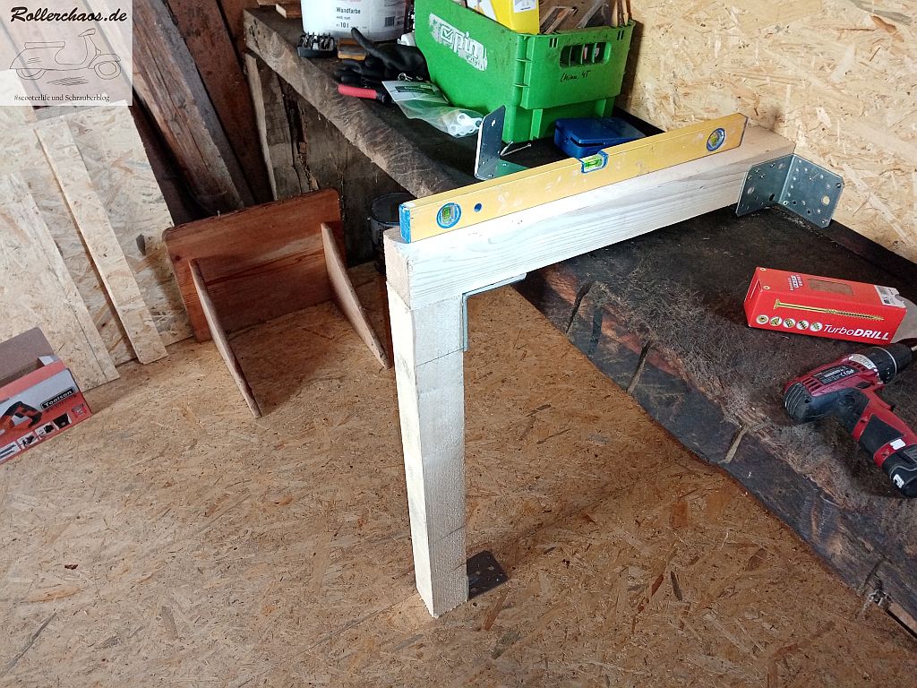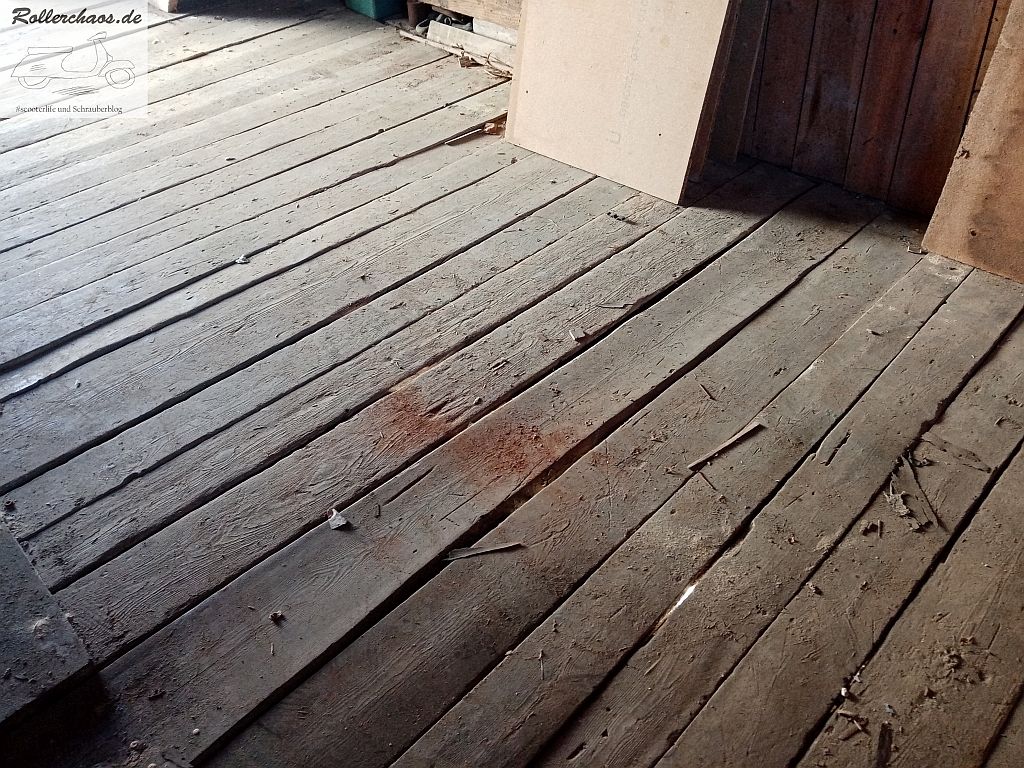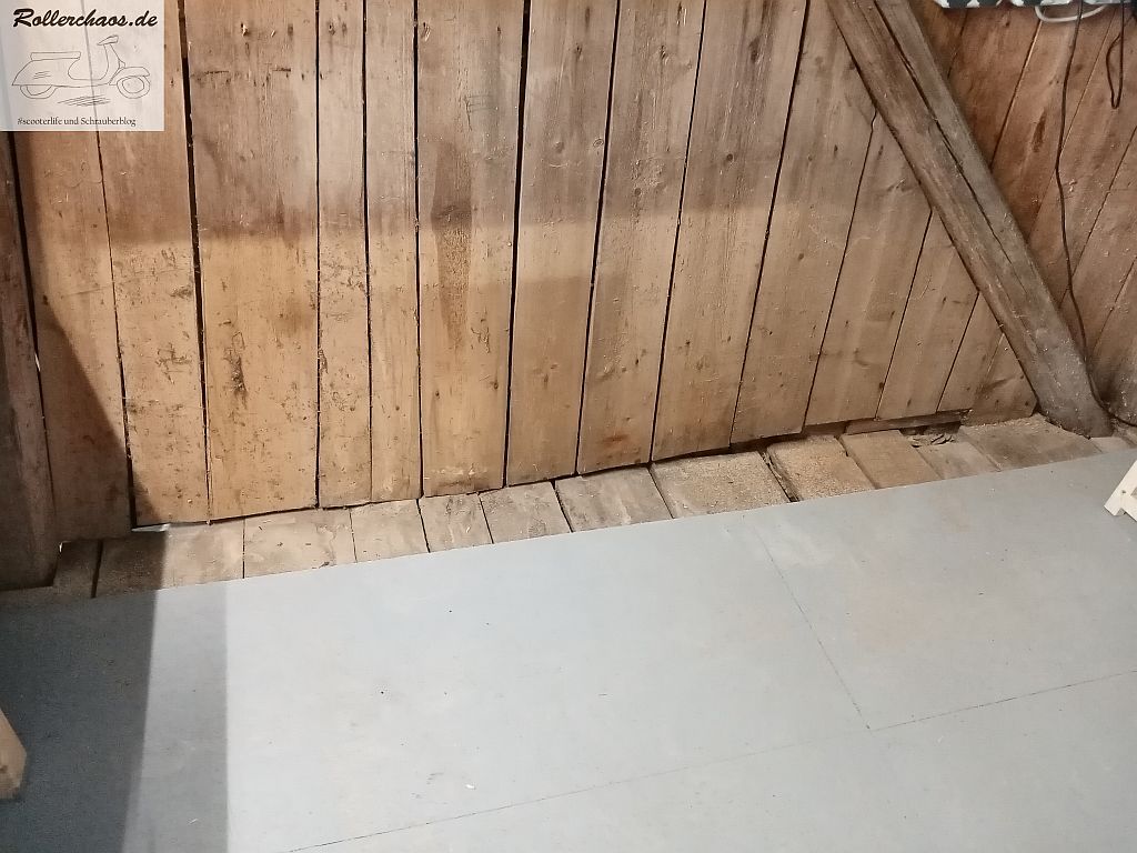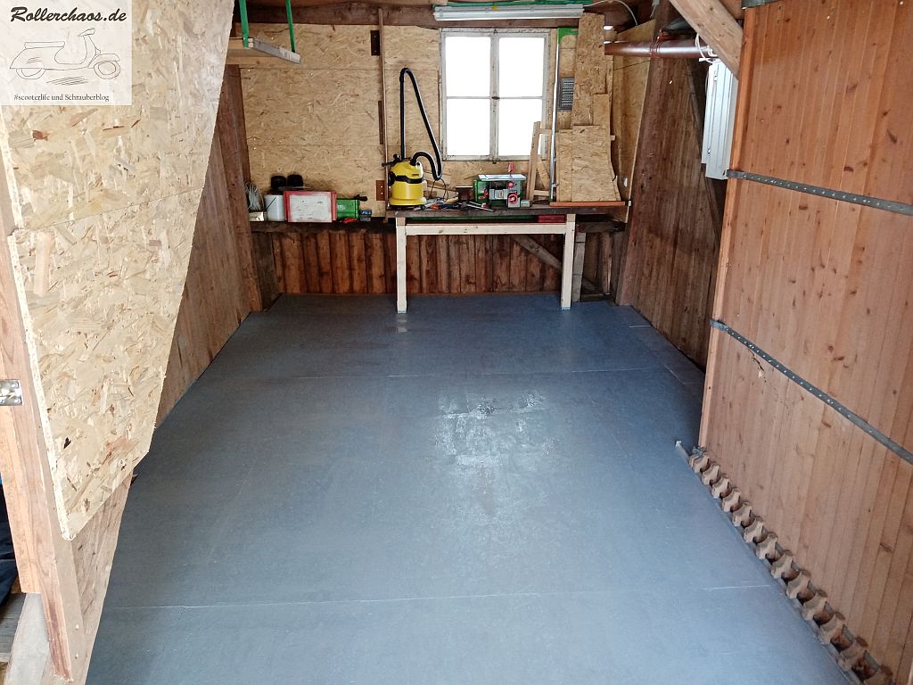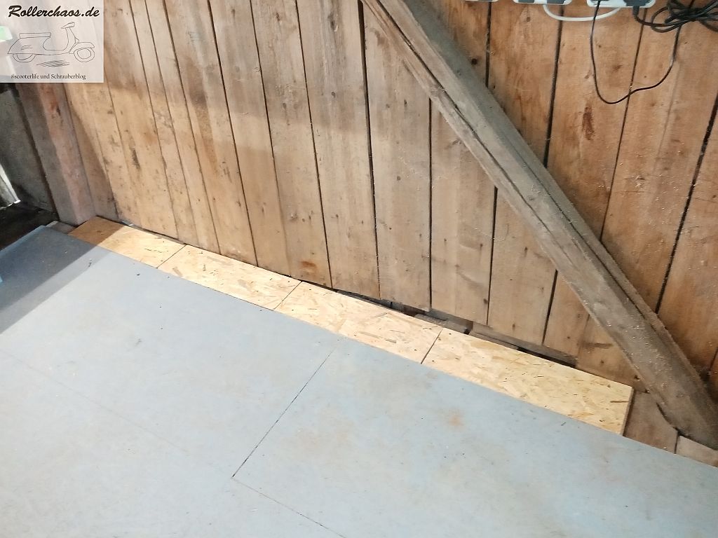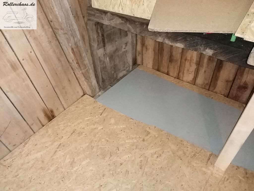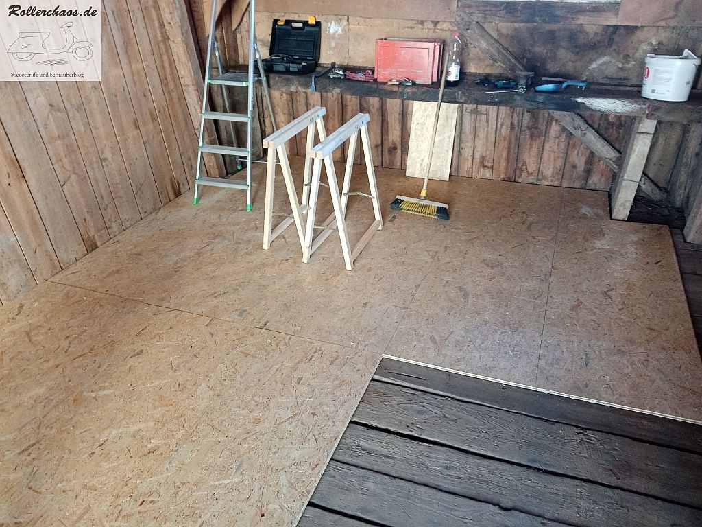 Darum war ich froh, dass mir Sepp von Scoopyontour.de die Tage geholfen hat, den Boden ordentlich zu gestalten. Zunächst wurden die alten Bodenbretter fest mit den darunter liegenden Tragbalken verschraubt. Auf dieser soliden Basis haben wir dann OSB-Platten verlegt.