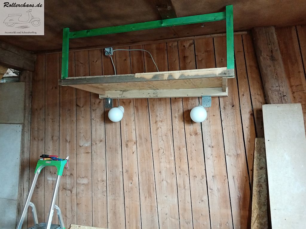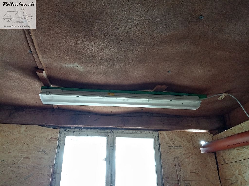 Über der Werkbank habe ich eine sehr helle (und teure) LED-Leuchte. Diese zieht als einzige Lampe vom Keller in die neue Werkstatt um. Die anderen Lampen werden unten schlicht noch gebraucht. Überhaupt erfordert die größere Raumhöhe in der neuen Werkstatt ein völlig anderes Lichtkonzept als der niedrige Keller.