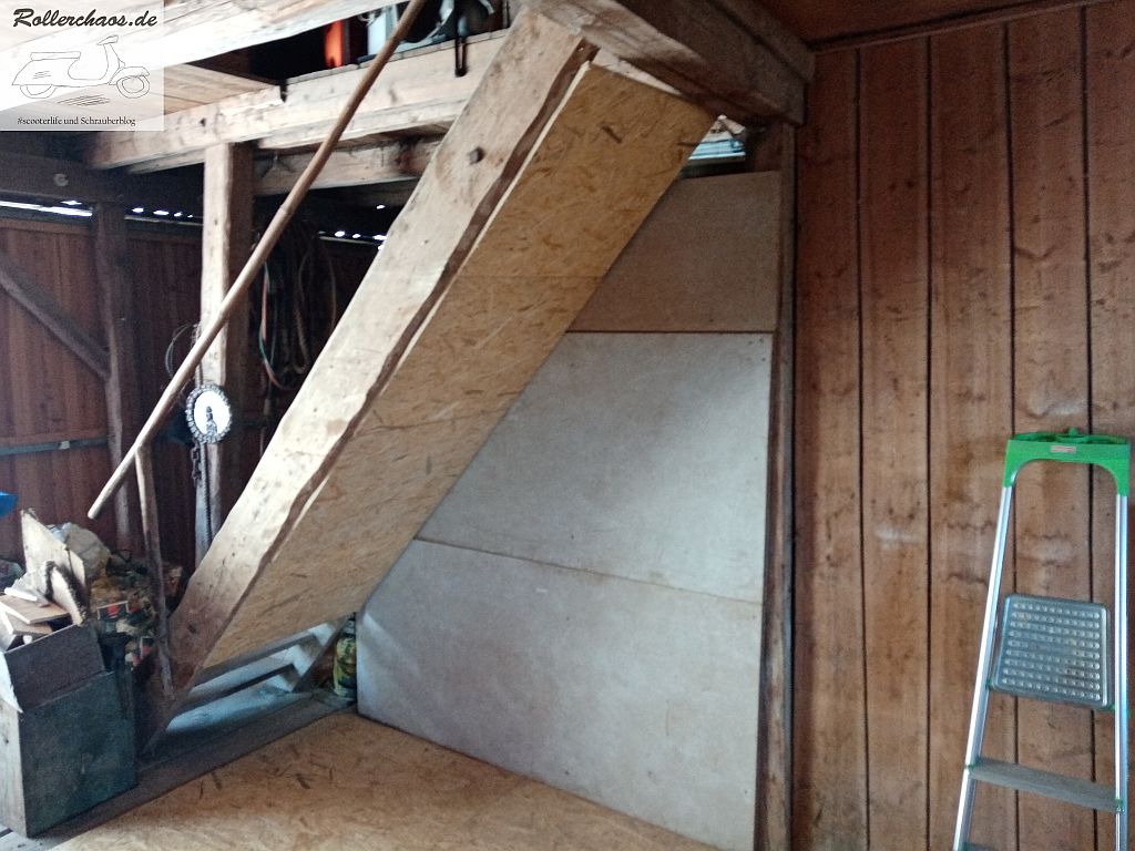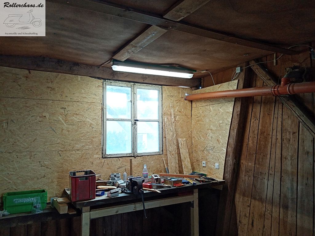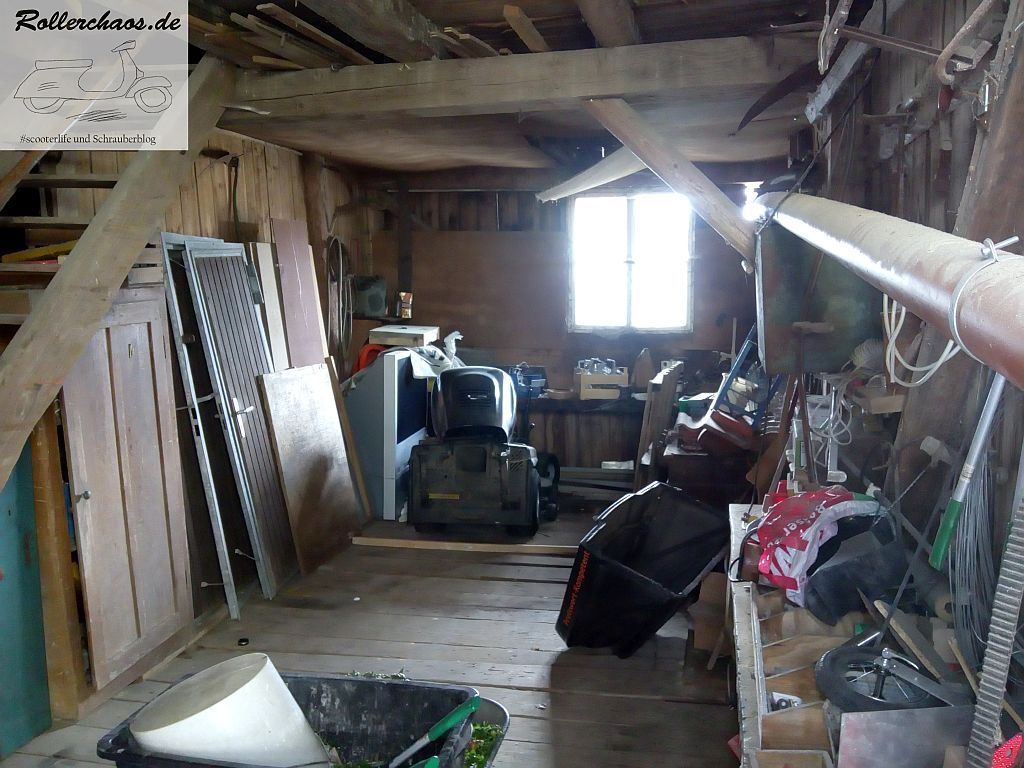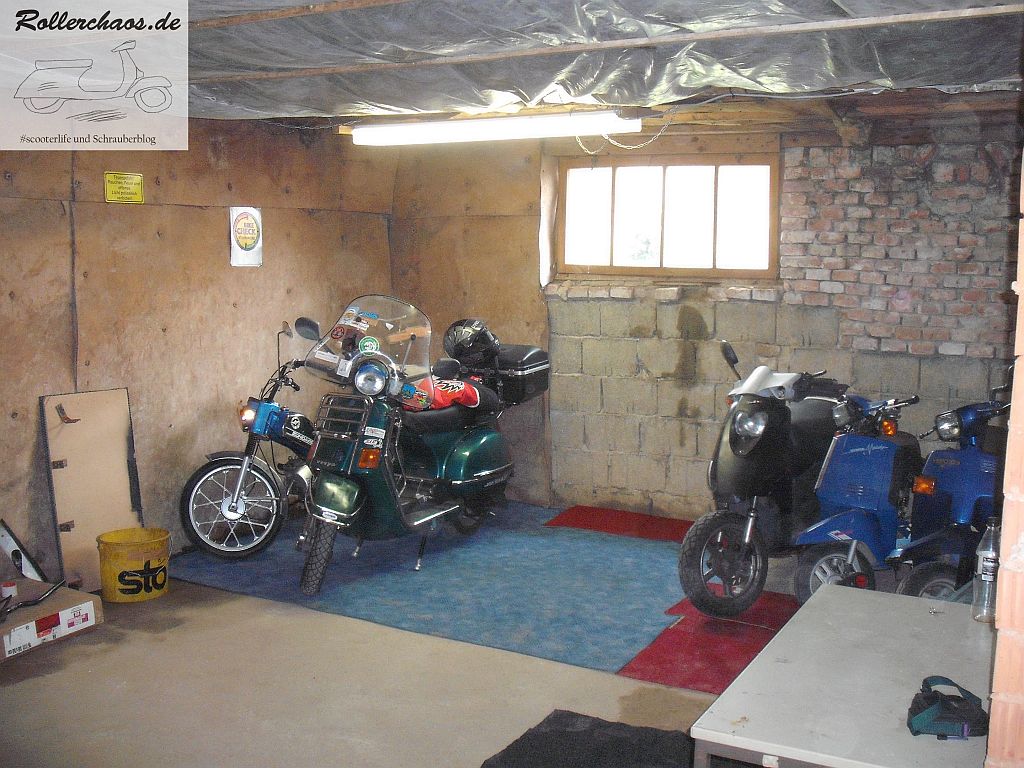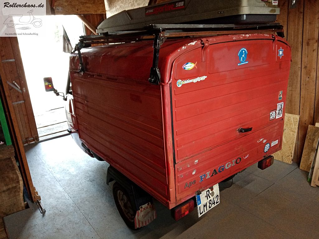 Es ist relativ eng, das stimmt schon. Aber das ist ja auch keine Garage für den täglichen Gebrauch. Es geht ja darum, dass die Ape auch mal länger stehen kann, wenn größere Arbeiten fällig sind. Ein solcher Eingriff ist für den Sommer auch noch geplant.