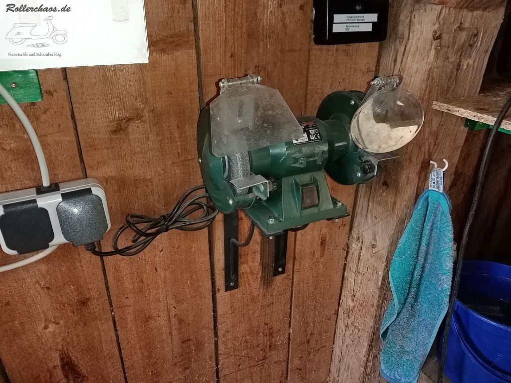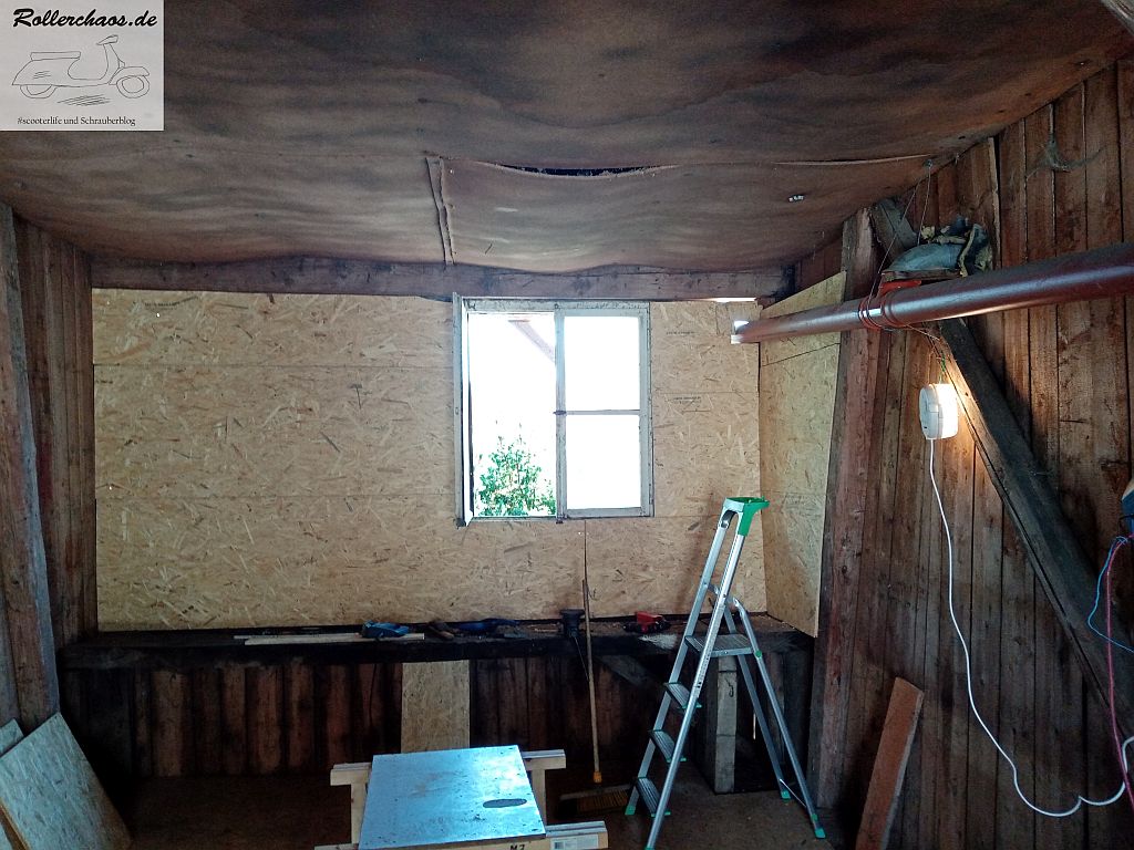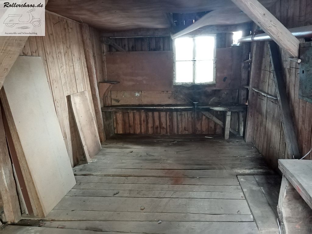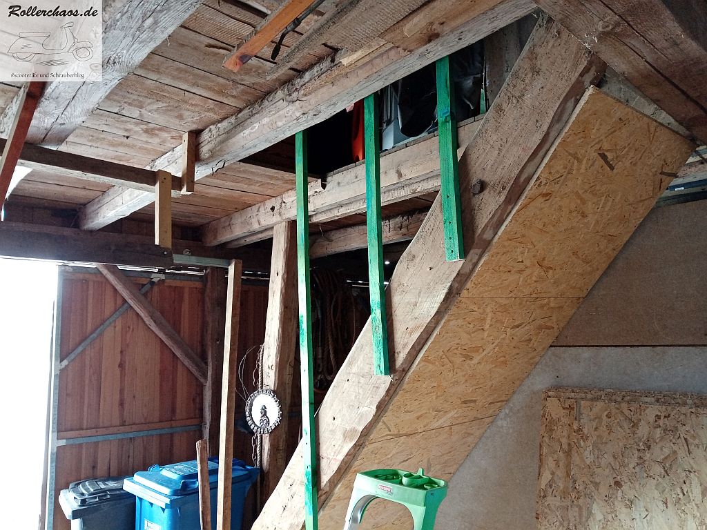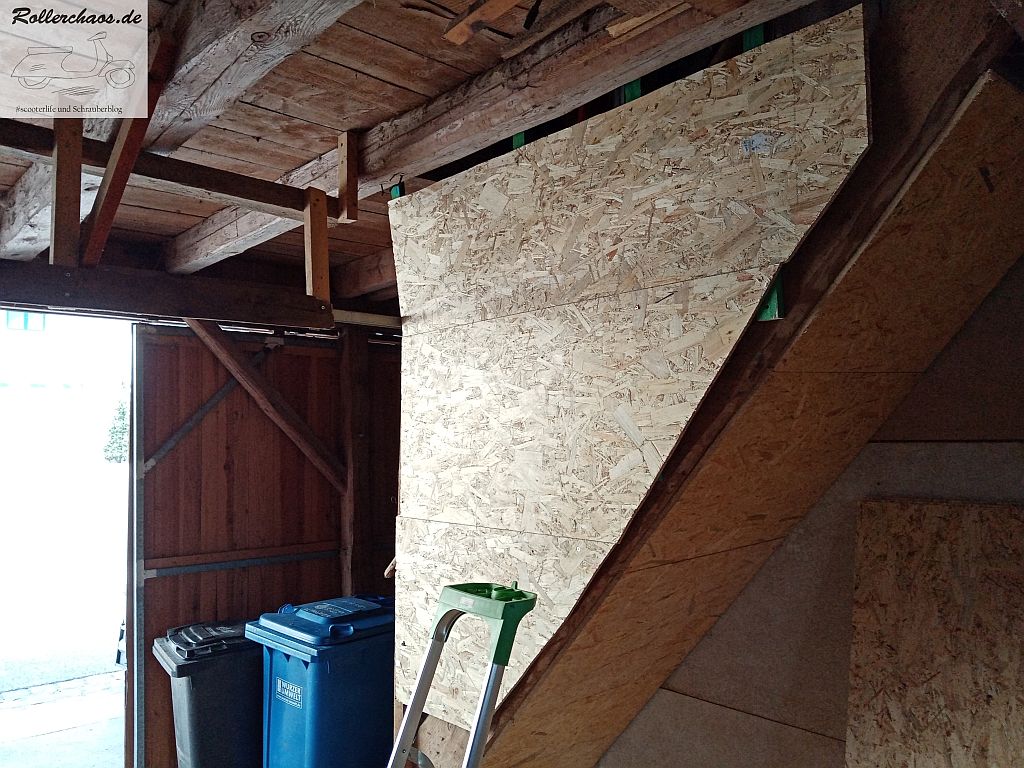 Es ist relativ eng, das stimmt schon. Aber das ist ja auch keine Garage für den täglichen Gebrauch. Es geht ja darum, dass die Ape auch mal länger stehen kann, wenn größere Arbeiten fällig sind. Ein solcher Eingriff ist für den Sommer auch noch geplant.