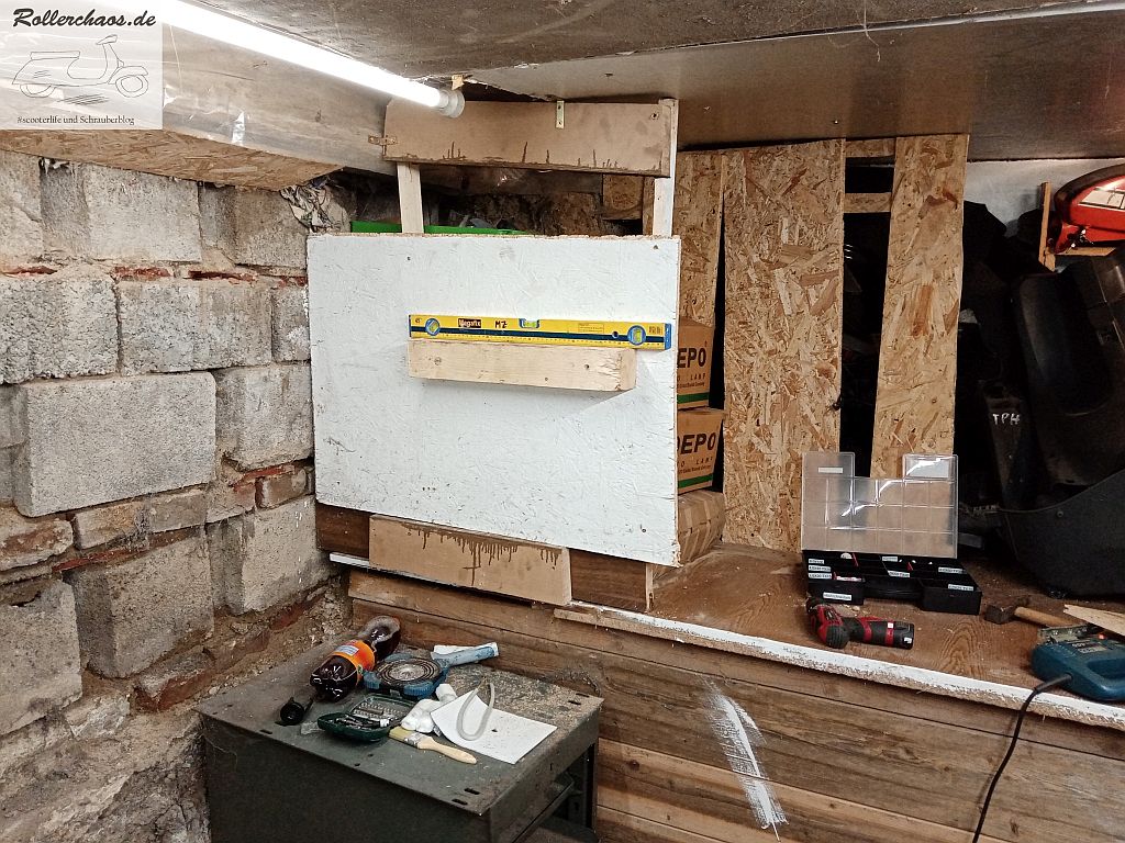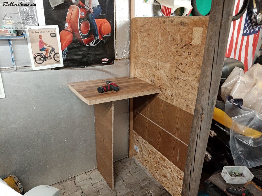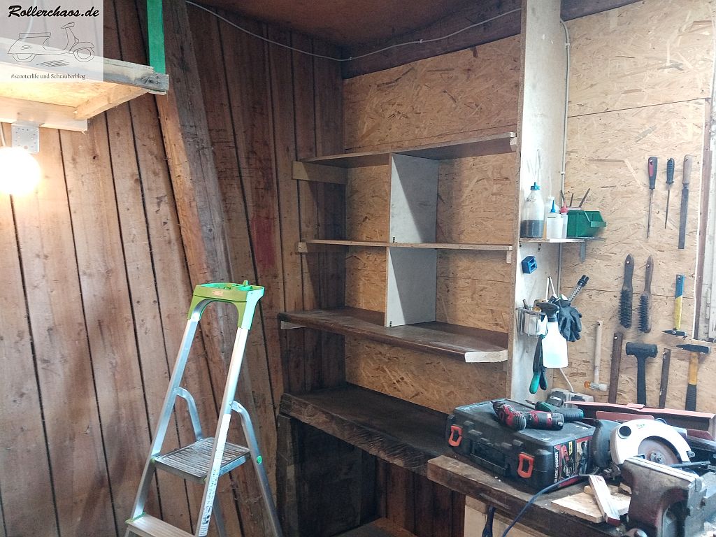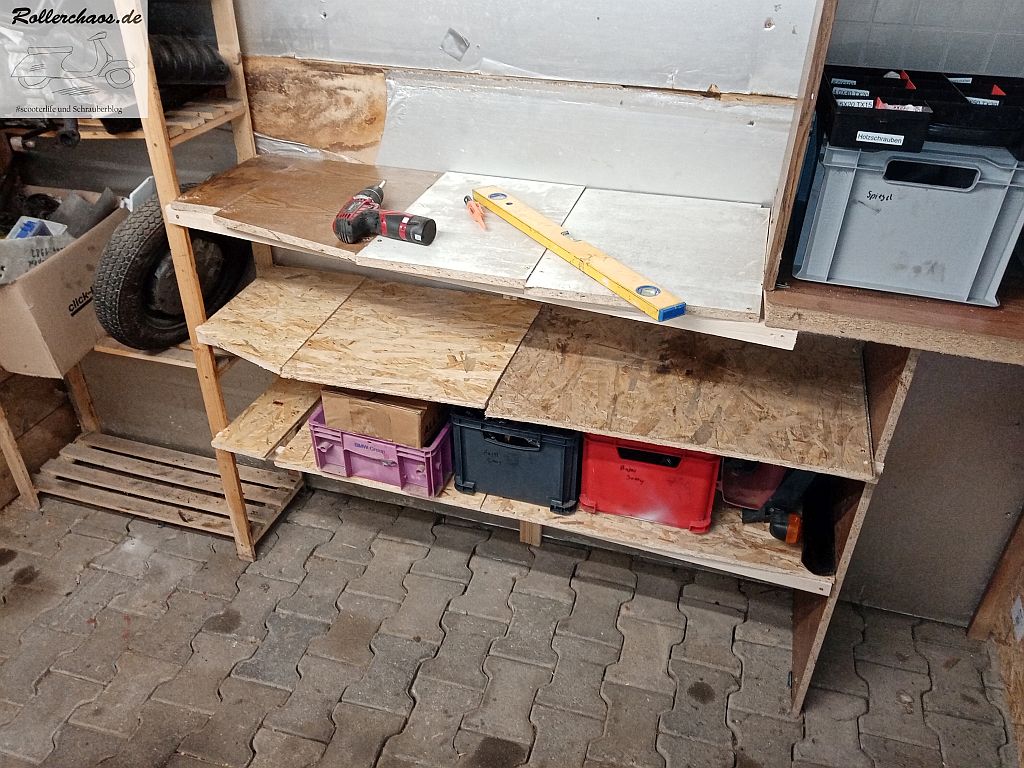Insbesondere die alte Deckplatte des Schranks, eine richtig solide Arbeitsplatte, war dafür ideal. Denn der untere Boden des neuen Werkzeugregals sollte ohne zusätzliche Stütze sein.