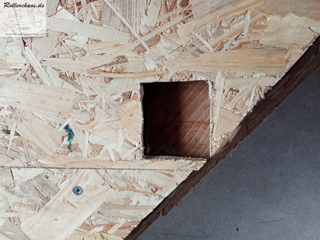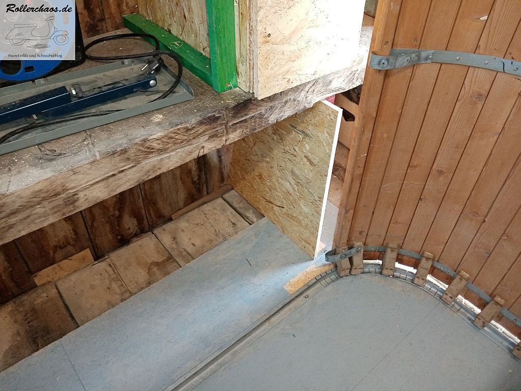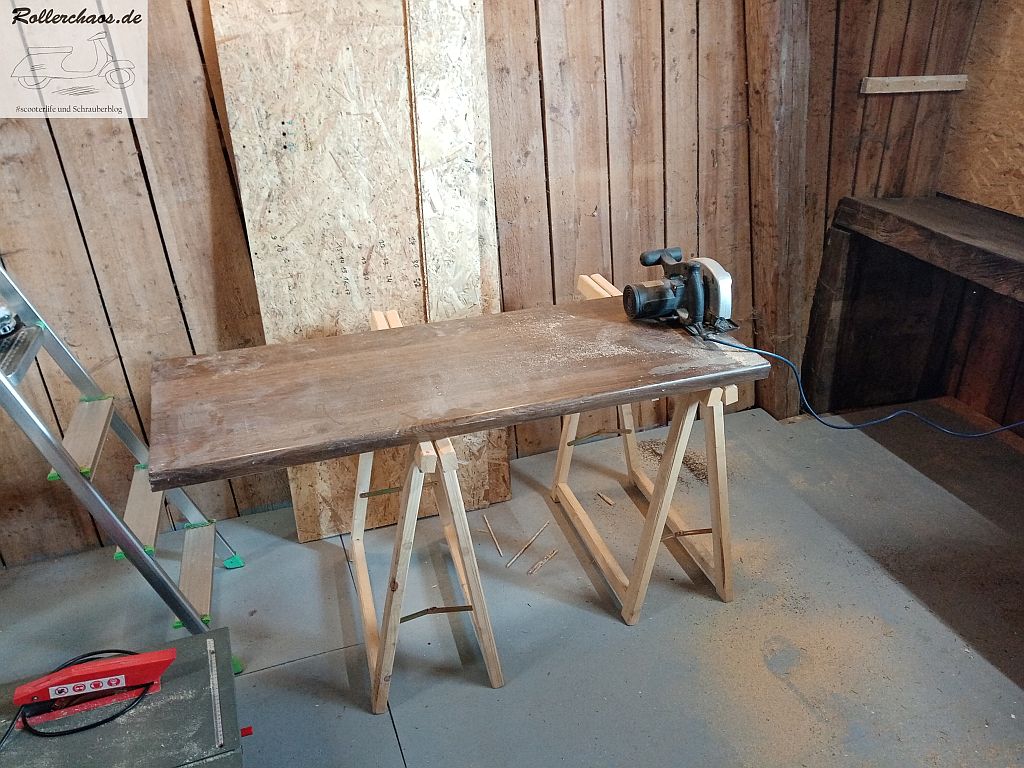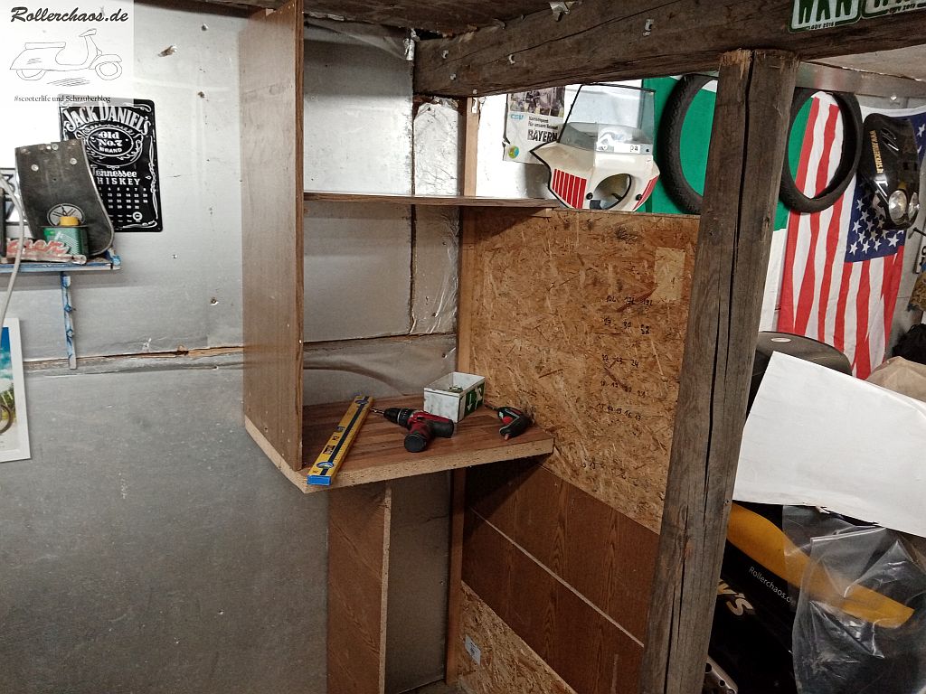 Insbesondere die alte Deckplatte des Schranks, eine richtig solide Arbeitsplatte, war dafür ideal. Denn der untere Boden des neuen Werkzeugregals sollte ohne zusätzliche Stütze sein.