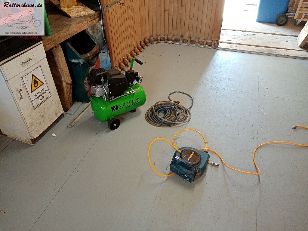 Aber sag, gab es keine Möglichkeit den Kompressor, mit Schalter in der Zuleitung von oben und nem langen Schlauch dazu im Keller zu lassen?