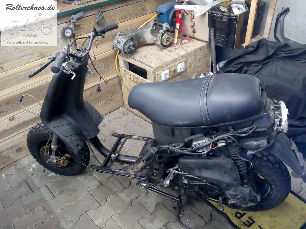 Das Fahrgestell ist mittlerweile komplett zusammengebaut, inkl. der Ölgabel aus dem Faceliftmodell und einem sehr guten, gebrauchten Sitz vom Faceliftmodell. Heute bekam der Roller noch ein neues Gaszuggeschirr und einen neuen Luftfilter. Damit war er dann endgültig bereit für die erste Probefahrt.