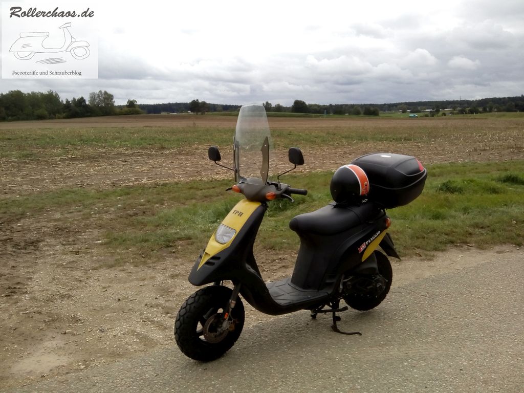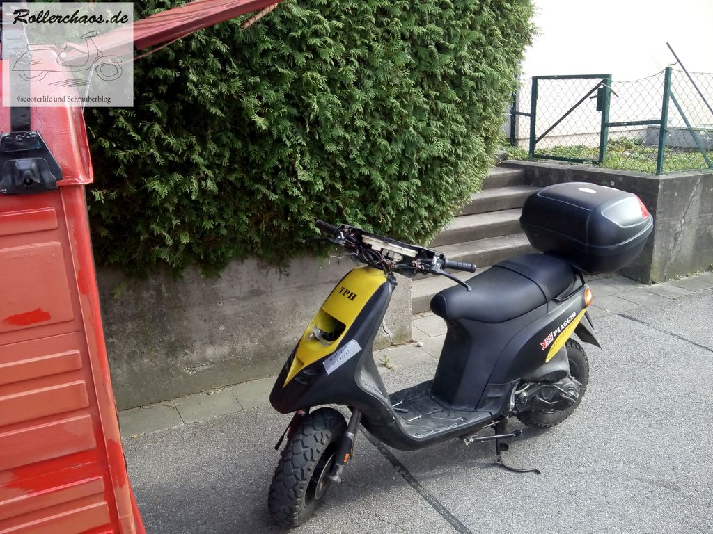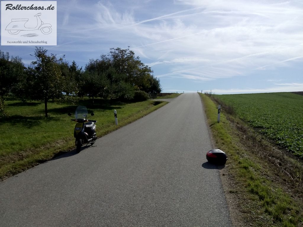 Auf der Heimfahrt, nur ein paar Kilometer von der Werkstatt entfernt, gab es dann noch eine Schrecksekunde. Nach einer Bodenwelle kam ein lautes Krachen von hinten, zum Glück aber nicht vom Roller. Das Topcase hatte beschlossen, sich von der Halteplatte zu trennen und zum Überholen anzusetzen.