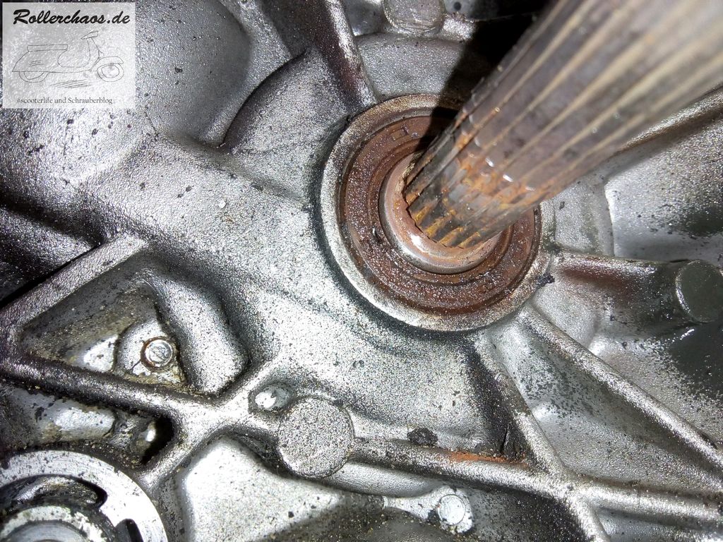 Der dahinter sitzende WeDi war, wie schon vermutet, gründlich undicht. Nachdem ich den WeDi heraus geholt hatte war auch klar warum. Zum einen war der Dichtring völlig verhärtet und zum anderen der Dichtsitz auf der Kurbelwelle komplett eingelaufen. Ein neuer WeDi wäre innerhalb kürzester Zeit ebenfalls wieder undicht geworden.