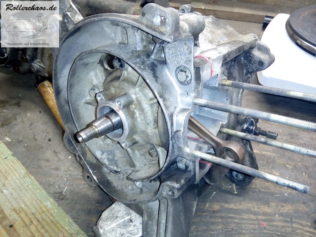Damit begann dann allerdings auch der Kampf gegen die Maschinerie. Der Motor ist, das wusste ich vorher, ziemlich ausgenudelt. Vor allem der antriebsseitige Kurbelwellenstumpf ist durch vielfache, stümperhafte Reparaturversuche ziemlich zerstört. Das Antriebsritzel für den Ölpumpenriemen wehrte sich allerdings sehr extrem. Der Lagerabzieher und die brutale Kraft des Schlagschraubers waren nötig, um das Teil von der Kurbelwelle zu lösen.