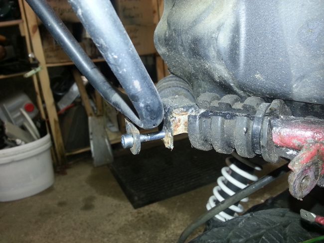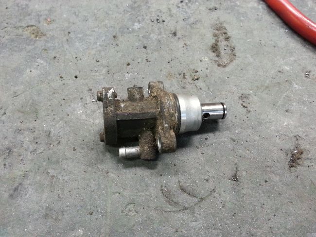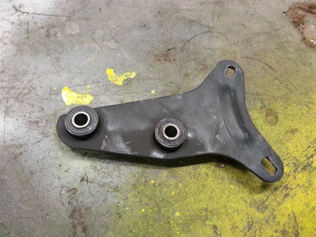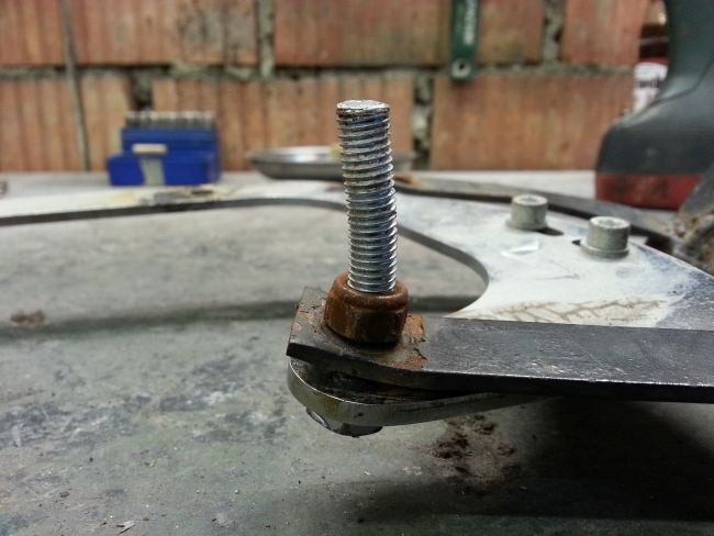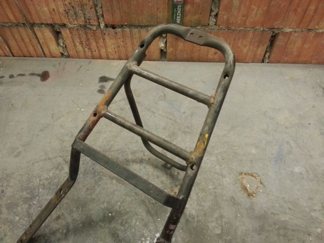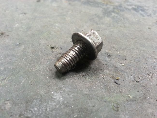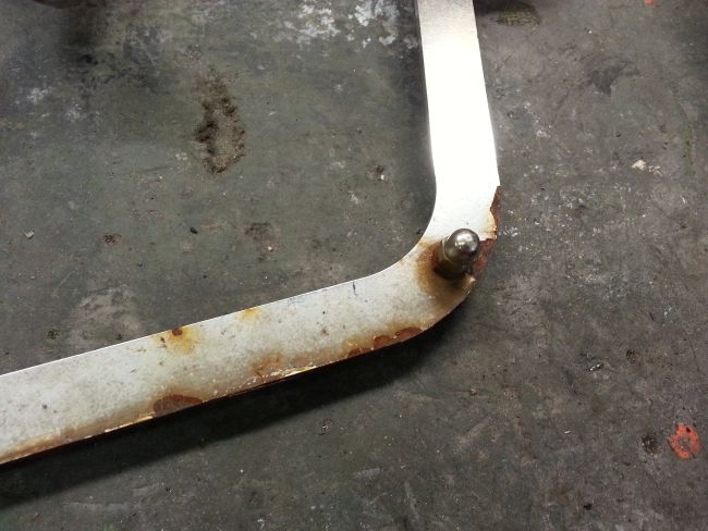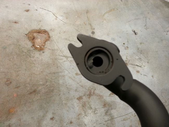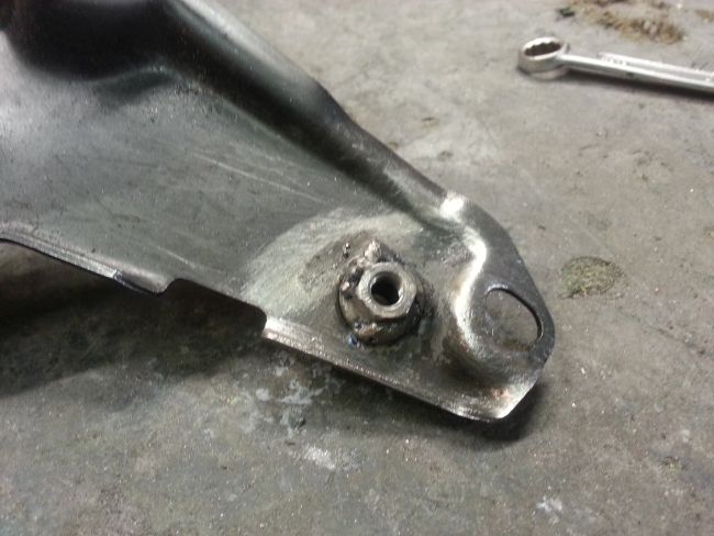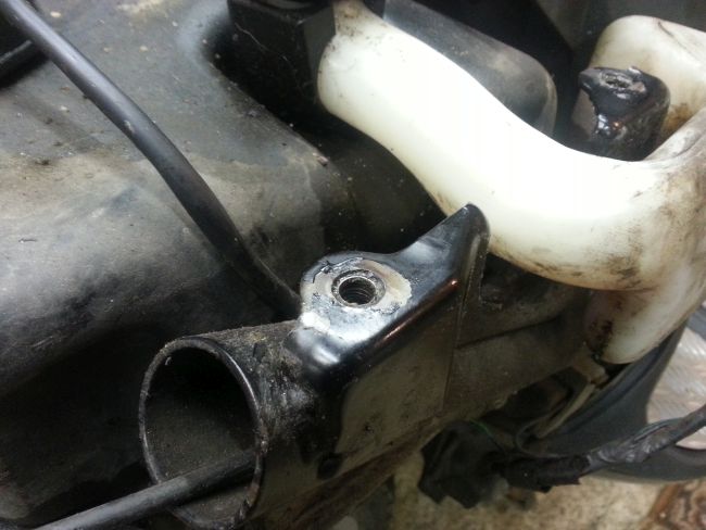 Hauptproblem ist der untere Anschraubpunkt. Bei diesem war das Gewinde ausgerissen. Man sieht auf dem Foto deutlich, dass diese Stelle bereits mehrfach geflickt wurde. Immerhin gibt es diesmal kein Rostproblem, sondern nur ein überlastetes Gewinde zu kurieren.