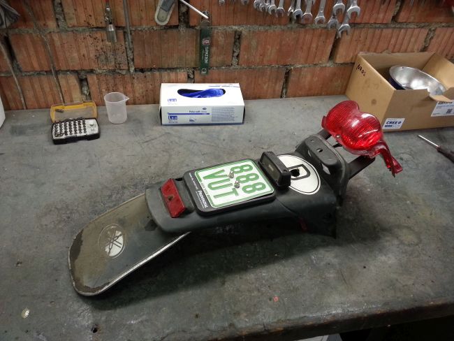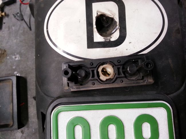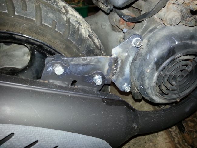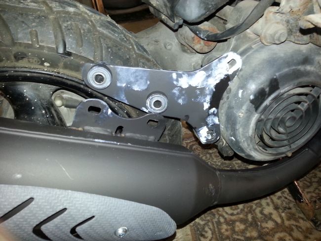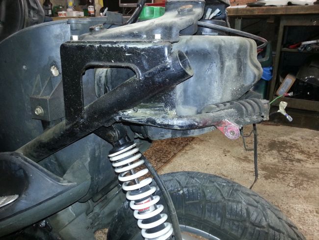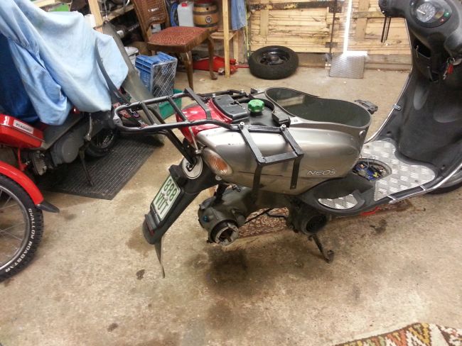 Wenn man den Gepäckträger ohne die Plastikteile des Rollerhecks montiert, kann man die Bohrungen wunderbar ausrichten. eine der vier Haltebohrungen oben muss ebenso nachgearbeitet werden wie die untere Stütze.