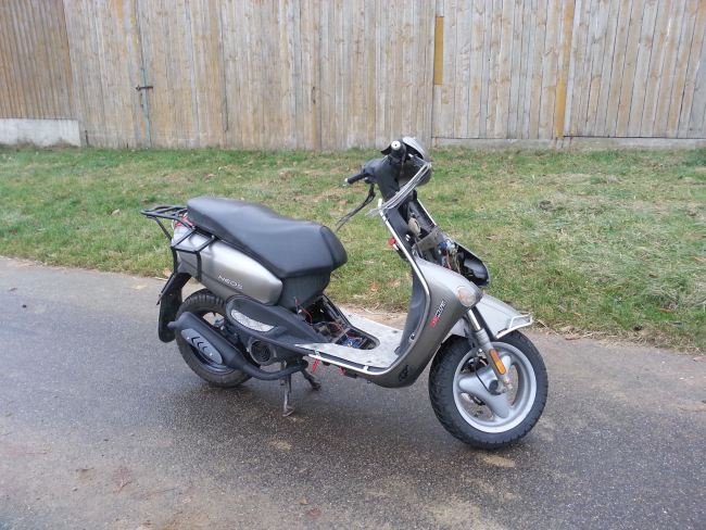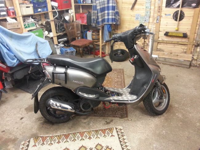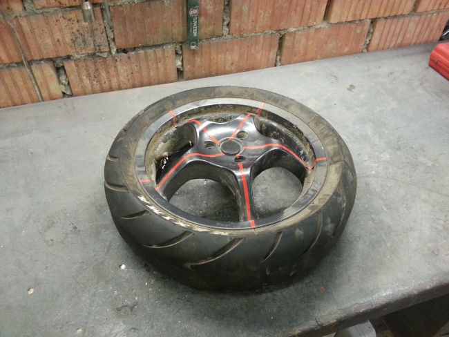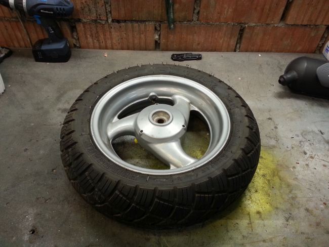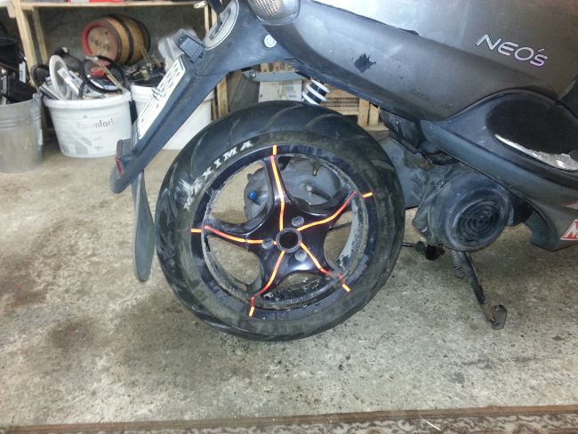 Im Winter will ich den Klingonenkreuzer etwas aufhübschen. Dazu gehört auch, dass ich dem Hobel ein Aeroxhinterrad verpassen will (Gründe dafür werde ich später erläutern, das gehört hier nicht her). Das Problem dabei: Der Aerox hat 13" Räder, der Neos 12". Das Vorderrad soll orginal bleiben (Gründe dafür ... 😉 ), also nur hinten das Aeroxrad reinkommen. Dabei darf ich, dem Übersetzungsverhältnis wegen, den Abrollumfang nicht mehr als 0,5% verändern, sonst gibts keine Eintragung. Außerdem muss ich eine beim Aerox homologierte Reifengröße verwenden.