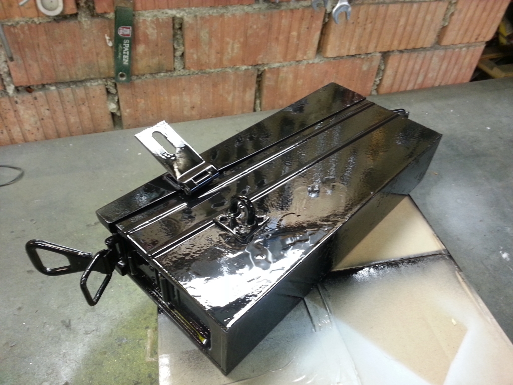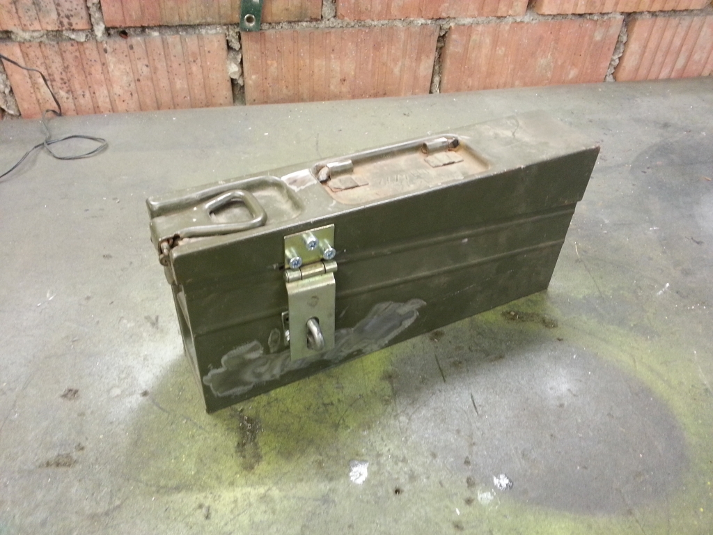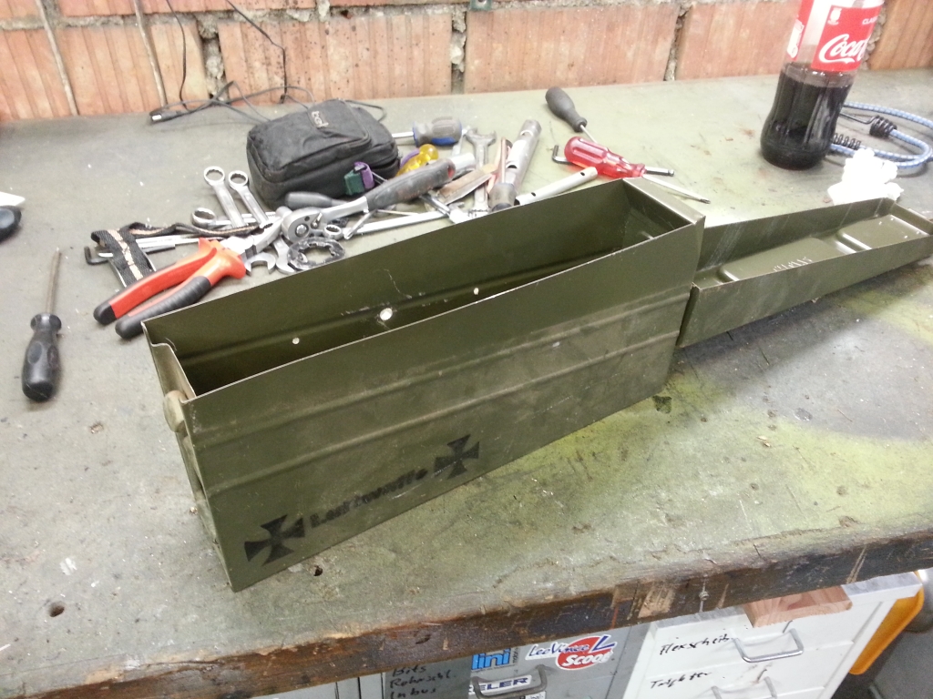 Anschließend bekam die Box eine grobe Dusche mit schwarzem Lack, was ja immer geht und weniger martialisch aussieht als Olivgrün. Die Trocknungszeit des Lacks habe ich aber auch genutzt und meine Fertigkeiten im Scherenschnitt geübt.