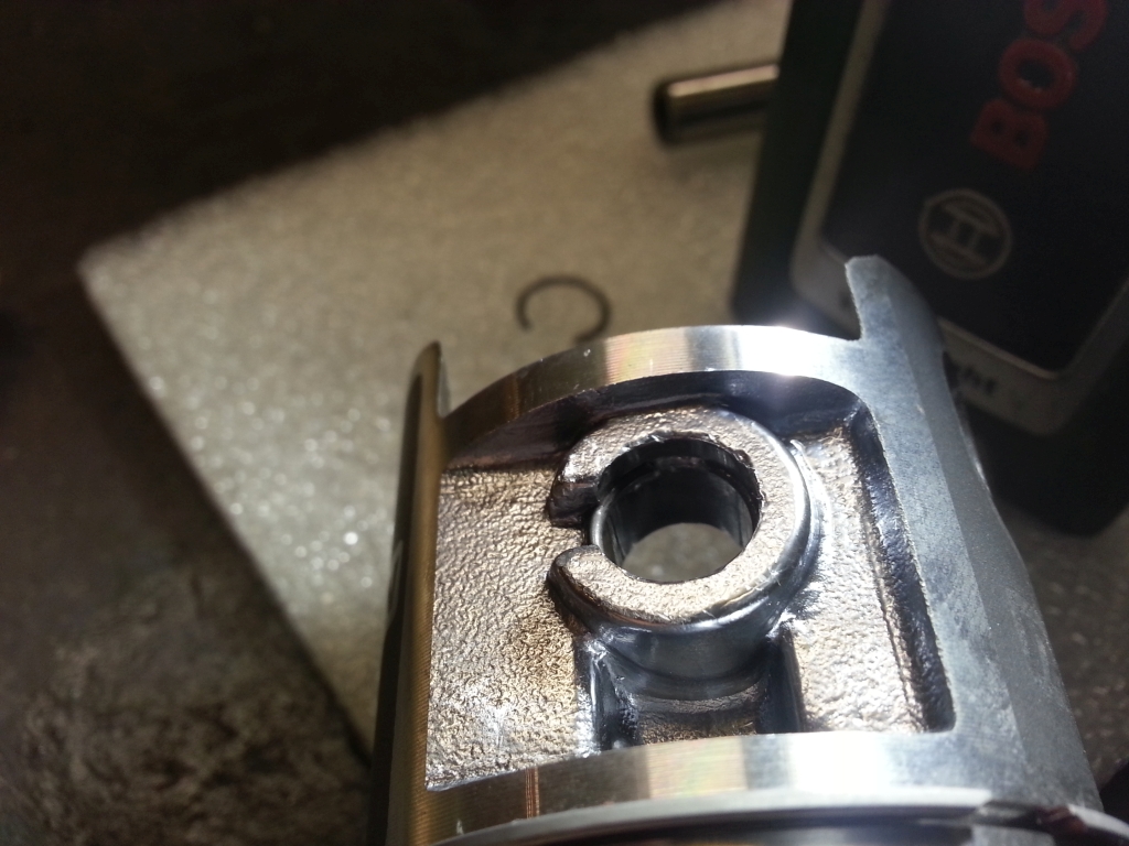Ich habe die Erfahrung gemacht, dass diese Vorgabe sehr sinnvoll ist. Darum vermute ich ja auch einen Montagefehler als Ursache für den letzten Fresser. Der Omegaring, der ja gehalten hat, war so eingebaut wie jetzt auch, der G-Ring möglicherweise quer zur Richtung, was ich leider nicht mehr nachvollziehen kann, da ein Foto fehlt. Bei Viertaktmotoren ist das mit den Sicherungsringen weniger kritisch, schon der erheblich niedrigeren Drehzahlen wegen. Das Foto täuscht auch etwas, da ist in dem Sinne keine Kante, sondern nur eine durchgehende Bohrung mit umlaufender Nut, in dieser Nut sitzt der Ring sehr stramm, es ist fast unmöglich ihn zu verdrehen und auch herausziehen würde sehr große Kraft erfordern. Ich verstehe was du meinst, bei PKW-Motoren sieht das von der Ausführung her i.d.R. anders aus, da gibt es ja sogar Konstruktionen die ganz ohne Kolbenbolzensicherung bzw. mit einer von unten eingebrachten Verschraubung arbeiten. Ersteres verbietet sich beim Zweitakter wegen der Überströmer, zweiteres wäre theoretisch möglich, aber dann müsste man wohl die Kurbelwelle ausbauen um den Kolben zu wechseln.