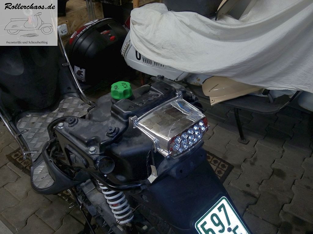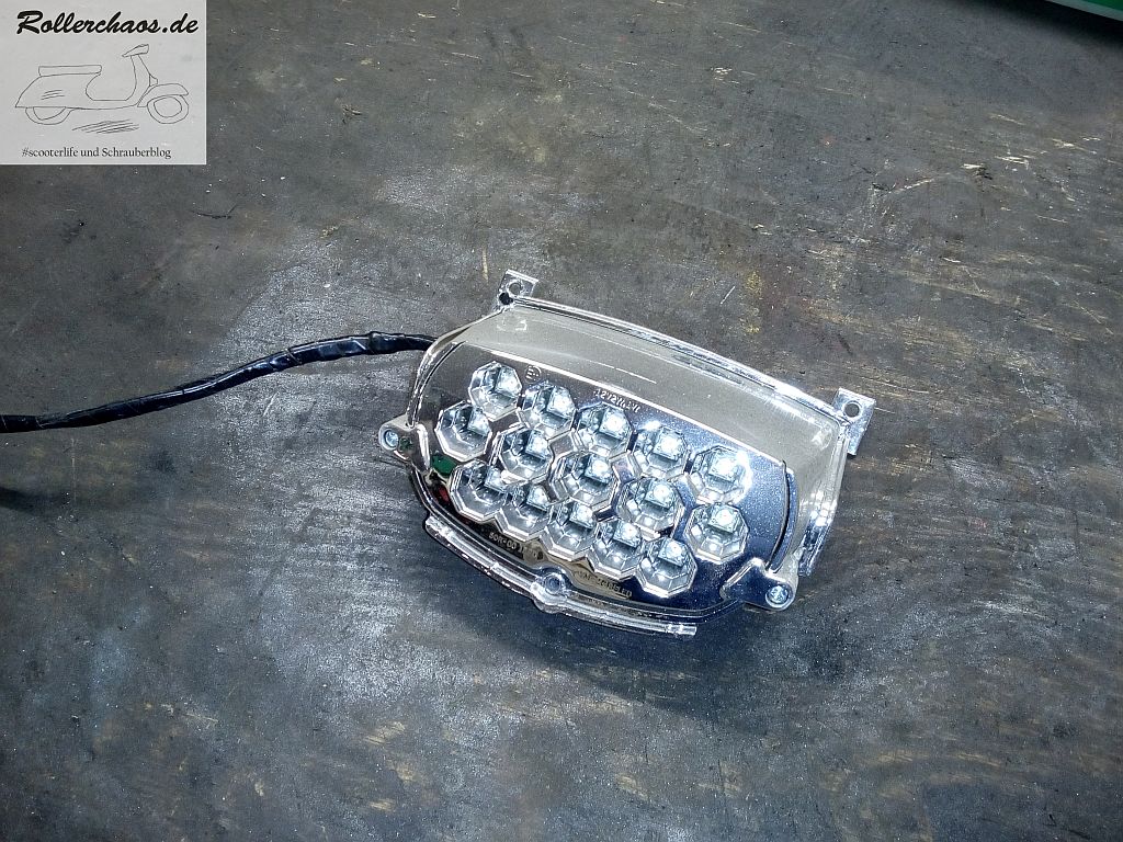 Der Ovetto läuft zwar wieder, aber zum Zusammenbau war ich letztens nicht mehr gekommen. Ganz bewusst nicht, denn es sollen noch ein paar Nebenarbeiten erledigt werden. So fehlte zum Beispiel noch das LED-Rücklicht. Das rare Teil mit Zulassung (!) gab es nur kurze Zeit, ich habe glücklicherweise noch eines und wollte es unbedingt in den neuen Roller übernehmen. Wer schonmal eine Rücklichtbirne beim Ovetto getauscht hat, der weiß auch warum.