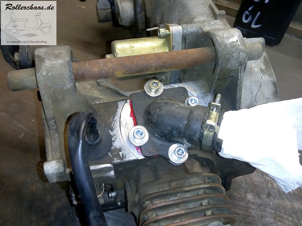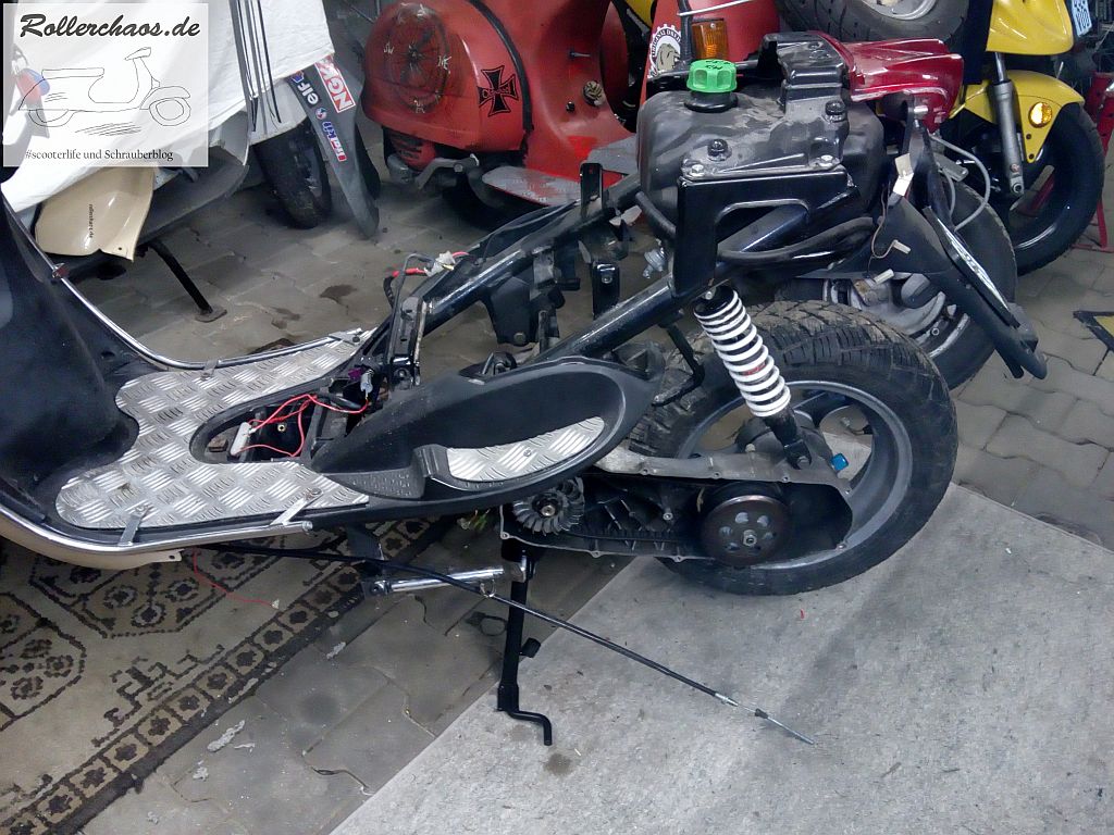Positiv ist, dass der Roller, zum ersten Mal seit ich ihn habe, wirklich sicher auf dem Hauptständer steht. Den Motor einhängen und anschließen ja zum Glück auch nicht weiter schwierig. In diesem Punkt ist der Minarellimotor tatsächlich eine schöne Konstruktion. Das der Roller auf dem Motor steht, statt von diesem geschoben zu werden, erleichtert den Einbau enorm.
