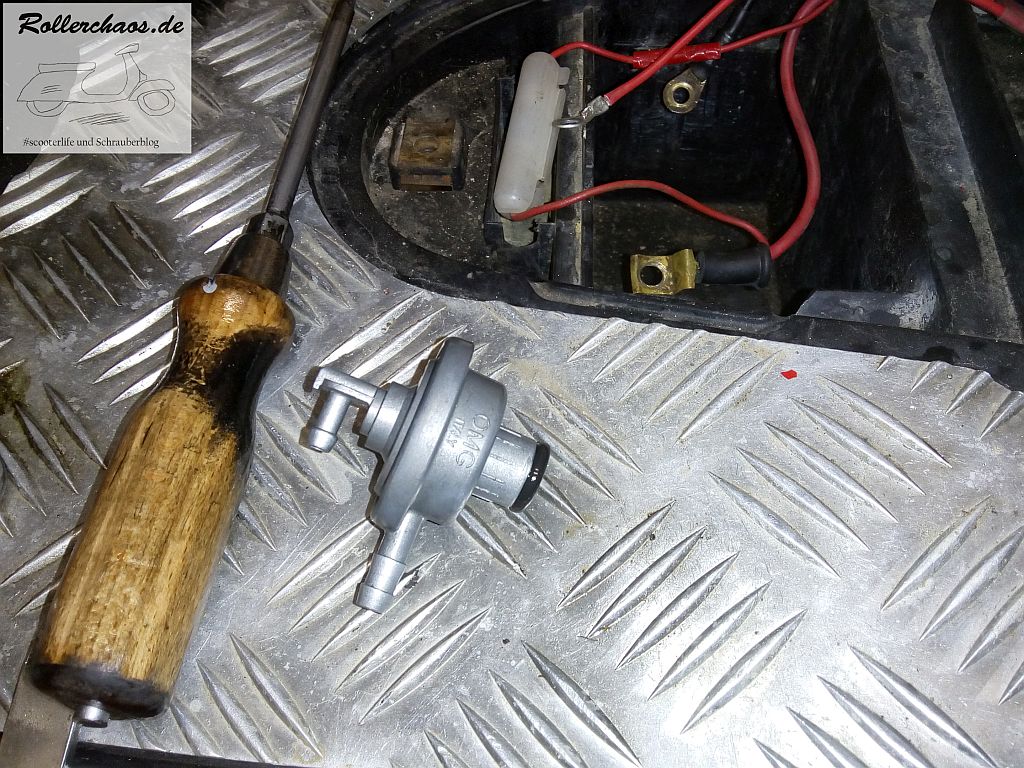 Für den Ovetto sollte eigentlich heute der Reparaturständer kommen. Aber auch dieser lässt noch auf sich warten. Allerdings war dennoch etwas Arbeit am Roller möglich. Den Treibstoff aus dem Tank ablassen zum Beispiel, denn ich wusste nicht genau wie viel Sprit drin war, außerdem ist eine Kontrolle des Tankfilters auf Sauberkeit nie verkehrt. Auch dazu war die Gelegenheit günstig.