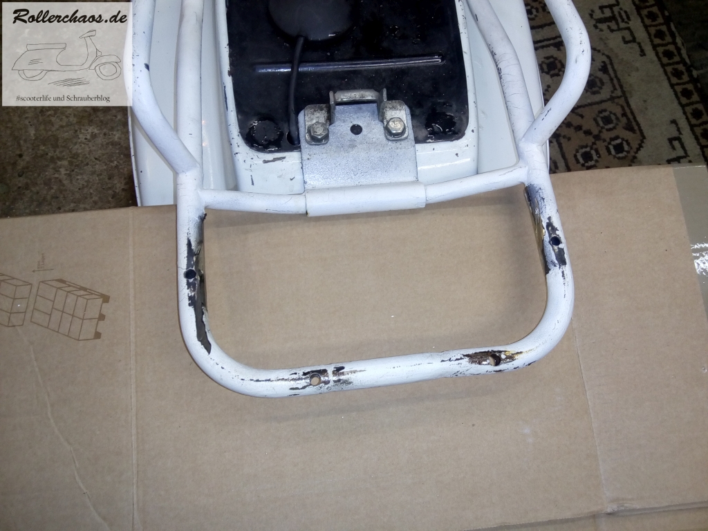 Die dafür beschrittene Lösung ist nur ein Provisorium, denn ich hatte weder das Material zur Hand noch die nötige Zeit um den Träger ordentlich zu verlängern. Allerdings passt der momentan vorhandene Träger sowieso nicht gescheit an die PK, die seitlichen Rohre berühren die Sitzbank und das ganze Teil scheint in sich verzogen zu sein.