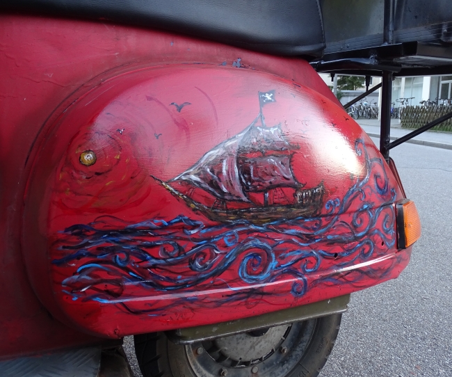 Die beiden Seitenbacken lagen seit November bei einer befreundeten Künstlerin die sie neu gestalten sollte. Ich hatte ihr dabei absolut freie Hand gelassen und um eine Überraschung gebeten. Seit Ostersonntag habe ich die Backen wieder und sie sind genial. Ich freue mich total über die neue Gestaltung der Rollerseiten.