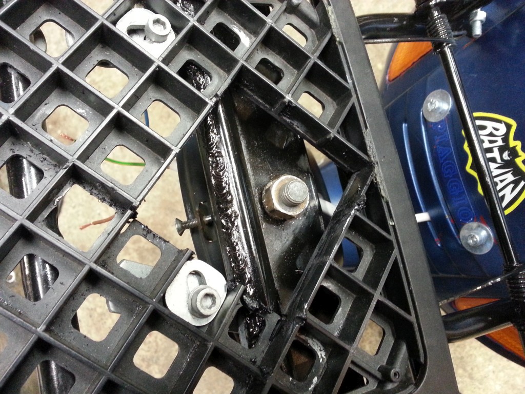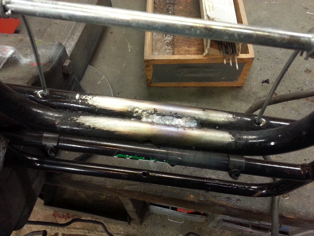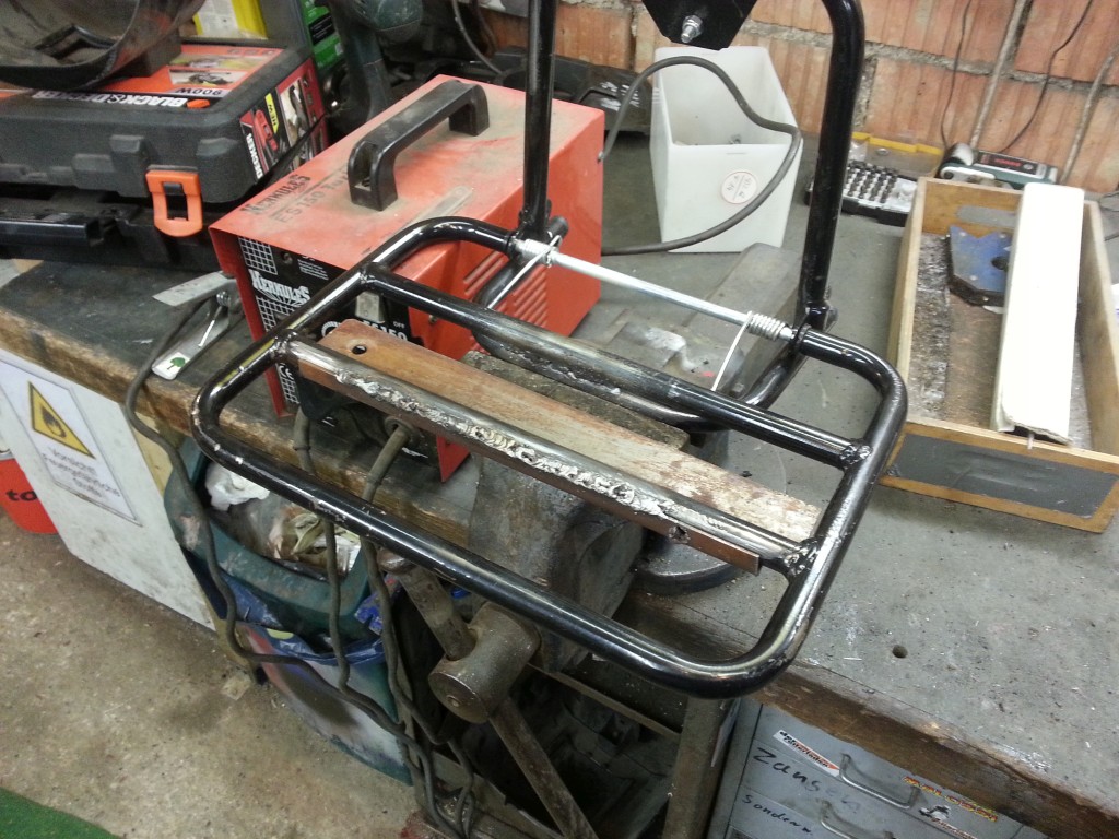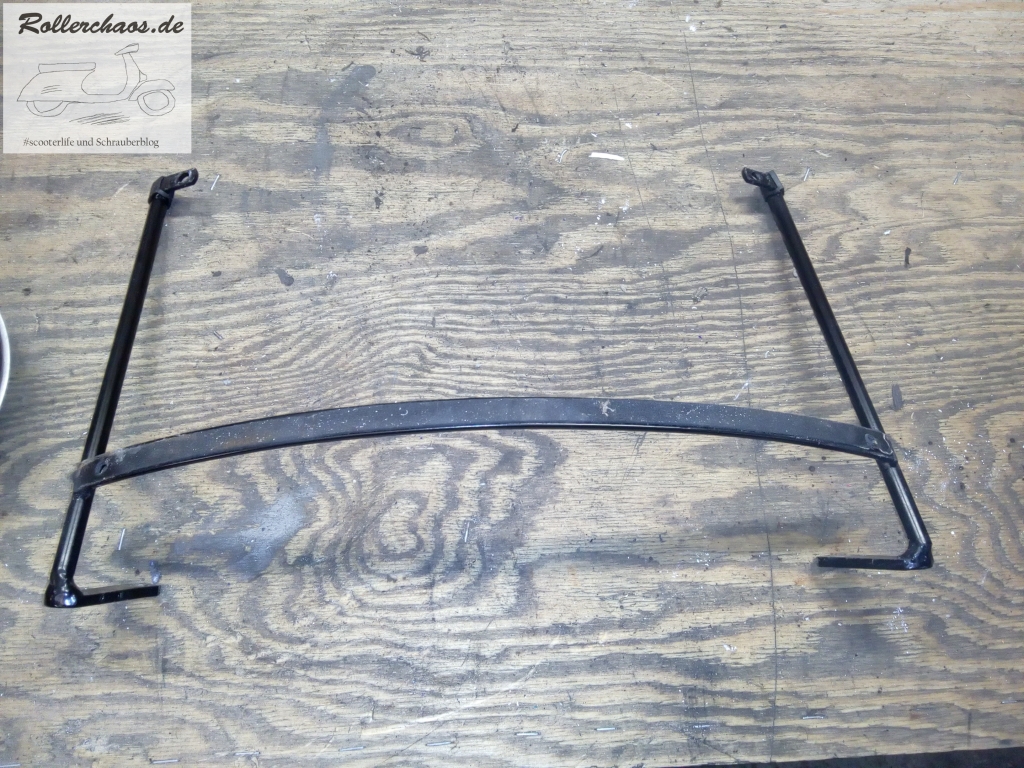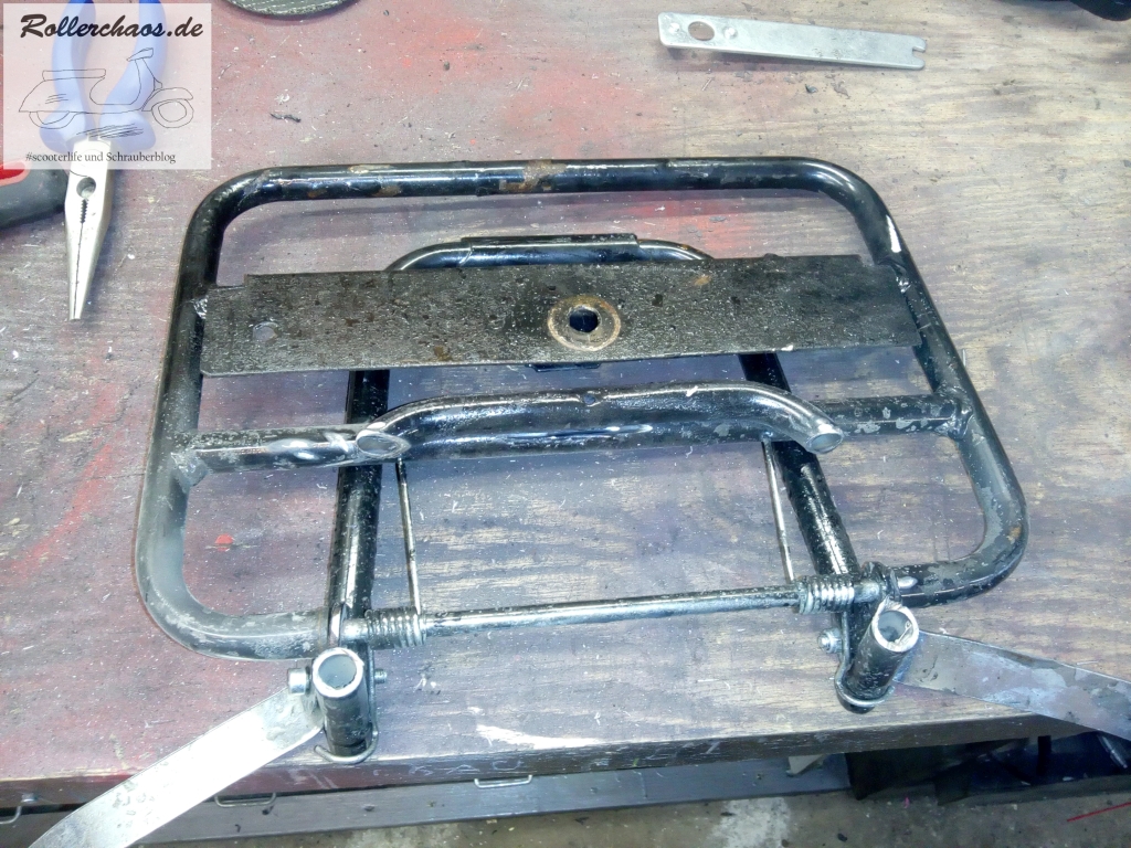 Nachdem die Reparaturen kaum eine Viertelstunde in Anspruch genommen hatten, war natürlich noch Zeit sich über das bereits angekündigte Umstyling der Frontpartie Gedanken zu machen. Zwei Dinge waren klar: Zum Einen sollte ein Werkzeugbehälter an die Front und zum Anderen der Gepäckträger gekürzt und wieder klappbar werden.
