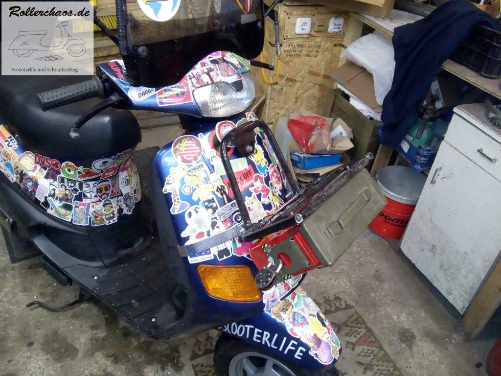 Auf den Frontträger gesetzt passt die Kiste sehr gut ins Gesamtbild der Maschine. Sie sitzt sauber und lässt sich zusammen mit dem Träger nach unten schwenken ohne zu stören. Außerdem blockiert sie den Lichtkegel des Scheinwerfers nicht, ein ganz wichtiges Detail, denn sie soll ja dauerhaft auf der Rollerfront bleiben.