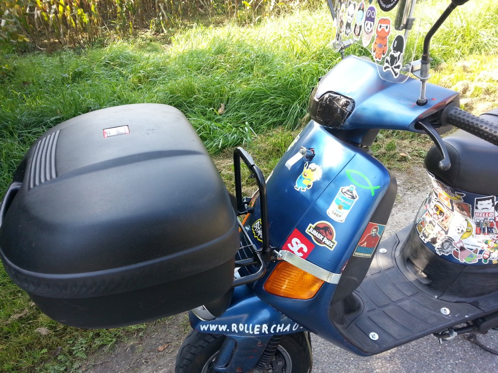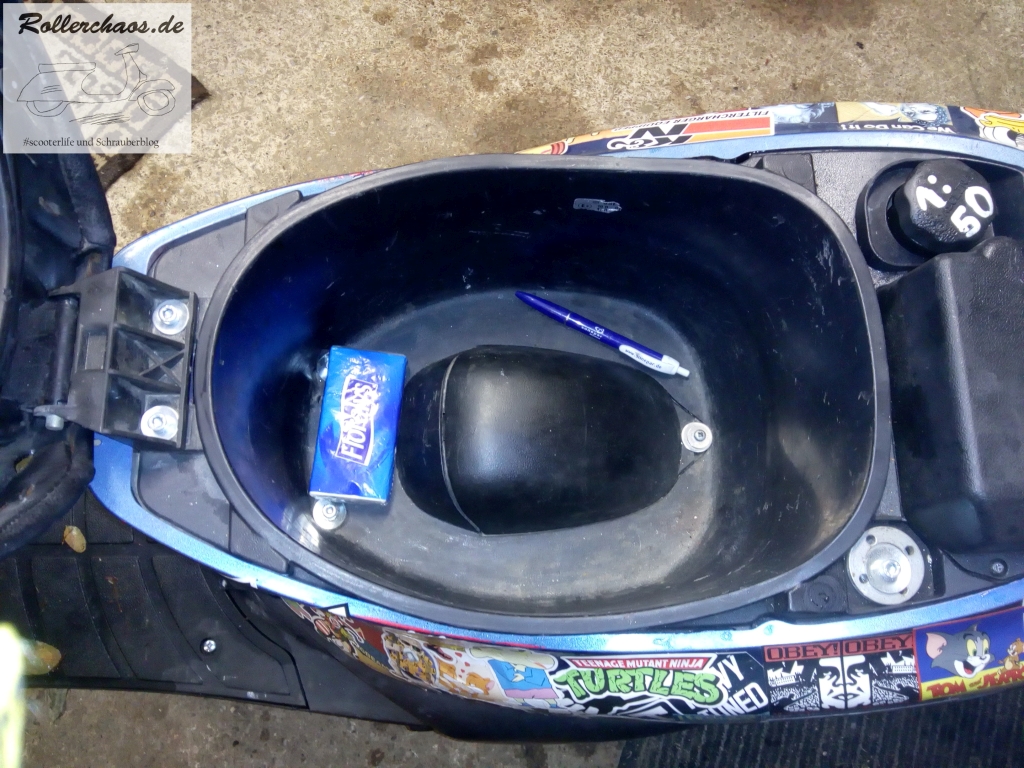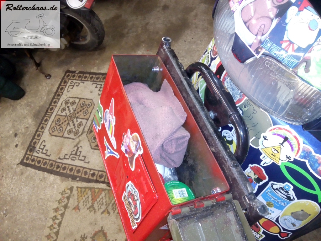 Die Kiste beherbergt jetzt all den auf Tour wichtigen Kleinkram der bisher das Helmfach verstopfte. Dieses ist nun frei und als Stauraum nutzbar, eine wichtige Verbesserung bei einem Roller, der relativ wenig Platz bietet und im Alltag wie auf Tour genutzt werden soll.