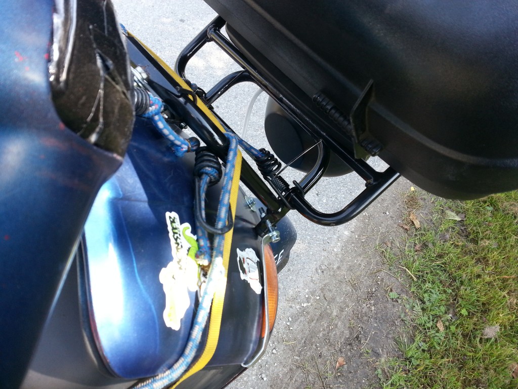Wichtiger ist da noch die Änderung am vorderen Topcase. Der Kindersarg kommt demnächst wieder weg, einfach weil das Teil aerodynamisch Probleme macht. Ab ~65km/h wirkt es wie ein Flügel und das Vorderrad wird brachial leicht. Ich vermute, dass sich da Luft unter dem Koffer staut, darum habe ich da auch schon eine andere, buchstäblich etwas luftigere, Idee.