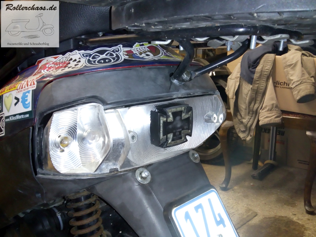 Der Scheinwerfer ist notwendig, denn die originale Lampe im Lenker ist bei dieser Konfiguration nicht mehr nutzbar. Aber er ist nicht wirklich gut. Das Licht ist zwar besser als beim Originalscheinwerfer, trotzdem überzeugt mich der Traktorscheinwerfer nicht wirklich. Es mag daran liegen, dass er eigentlich für ein H4-Leuchtmittel gedacht ist, ich ihn jedoch mit HS1 betreibe. Für H4 (54/54W) ist die Lichtanlage des Zips aber nicht stark genug. Die Idee hier ist, das Rücklicht durch ein LED-Rücklicht zu ersetzen und somit ein paar Watt zu "befreien". Dann könnte es klappen mit H4-Licht.