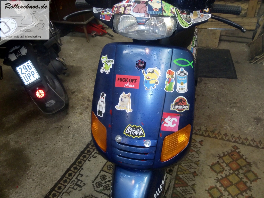 Während die Farbe auf der Kiste trocknete war Zeit sich um das grundlegende Styling der Front zu kümmern. Ich hatte zwischenzeitlich überlegt, den Zip im kommenden Winter ordentlich zu lackieren, allerdings gefällt mir das Stickerbombing eigentlich immer besser je öfter ich es sehe. Von der letzten Klebeaktion am Lenker waren noch ettliche Aufkleber übrig, Zeit die Front bunt zu machen.